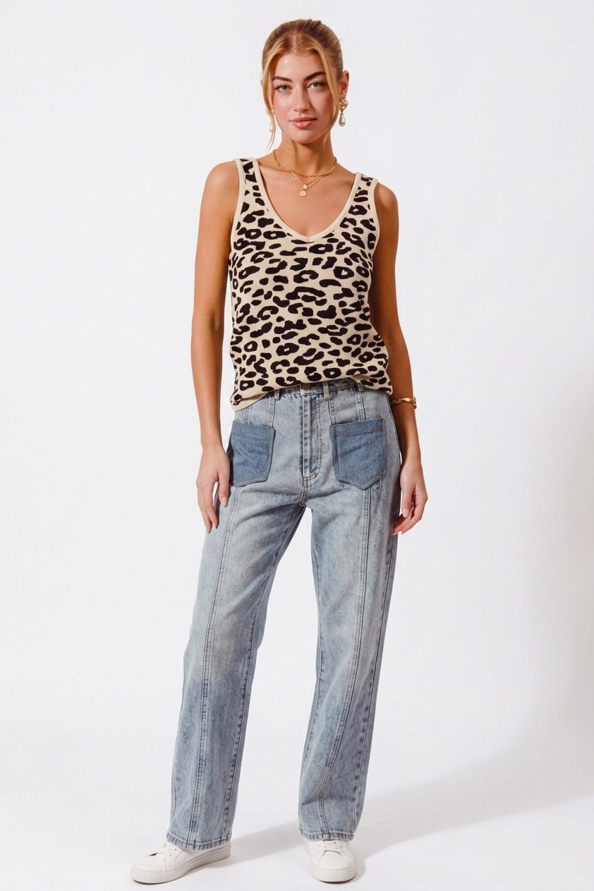 This chic leopard print knit cami tank is a must-have addition to your wardrobe. Crafted from a soft and breathable knit fabric, this cami tank offers a comfortable and flattering fit. The eye-catching leopard print adds a touch of wild sophistication, making it perfect for both casual and dressy occasions. The V-neckline and sleeveless design make it ideal for layering under jackets or cardigans, or wearing on its own during warmer weather. Its lightweight material ensures all-day comfort, while its easy-care properties make it a practical choice for everyday wear. Embrace your inner fashionista with this fashion and versatile cami tank.