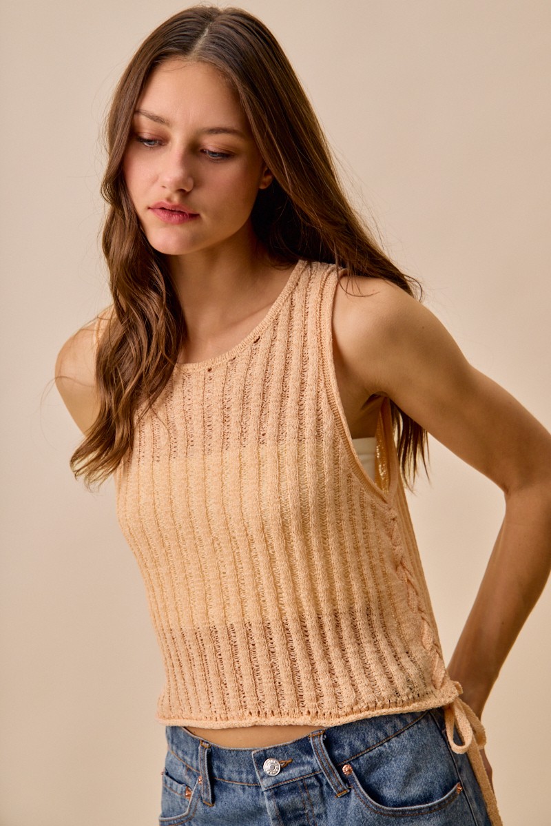 This Low Gauge Pointelle Lightweight Sweater Tank Top is a stylish and versatile piece for your wardrobe. The pointelle knit design adds a delicate and feminine touch to the sweater tank top. Crafted from a low gauge knit, it offers a lightweight and breathable feel. Perfect for layering or wearing on its own during the warmer months. An essential staple that can be dressed up or down for various occasions.