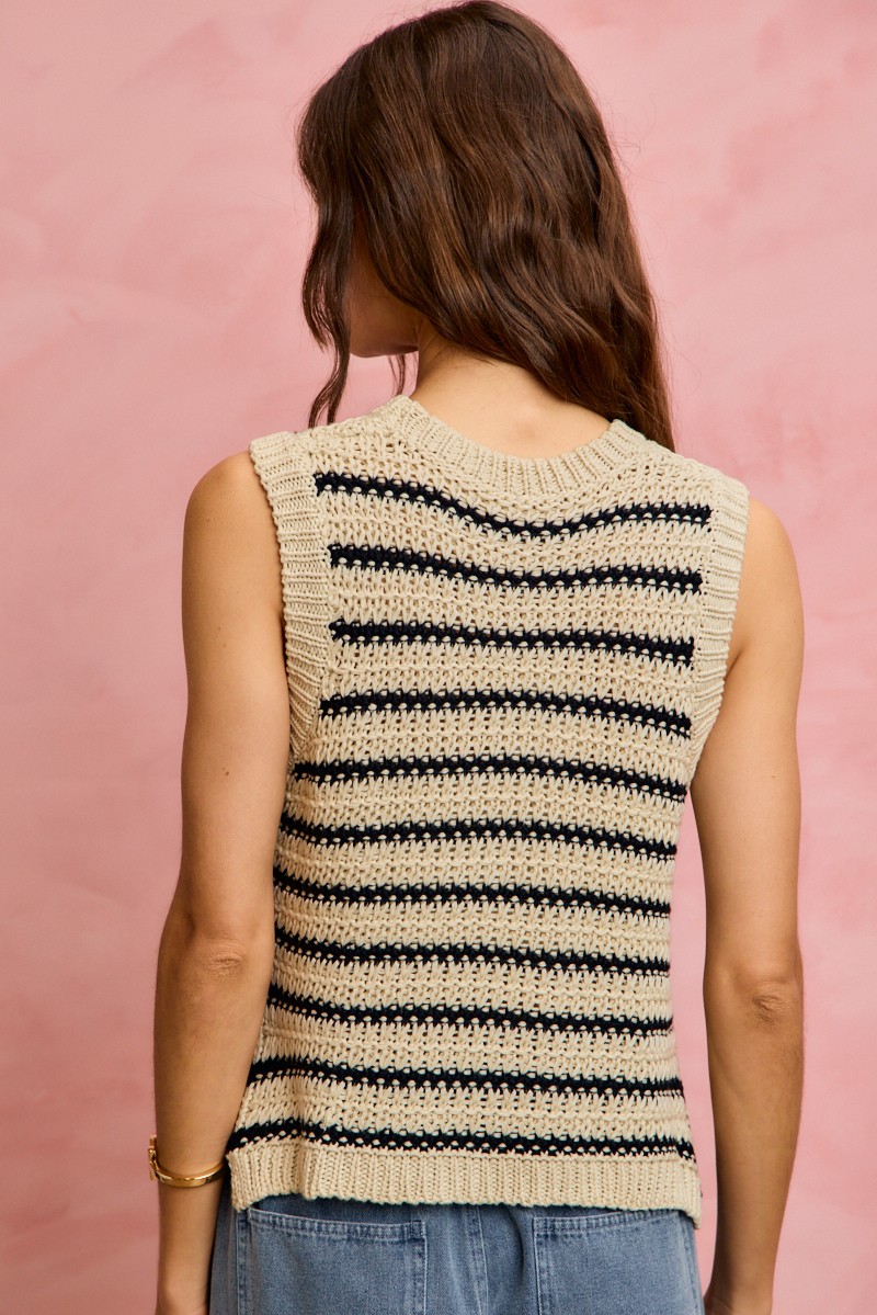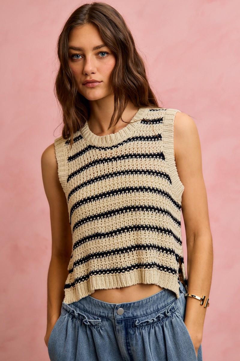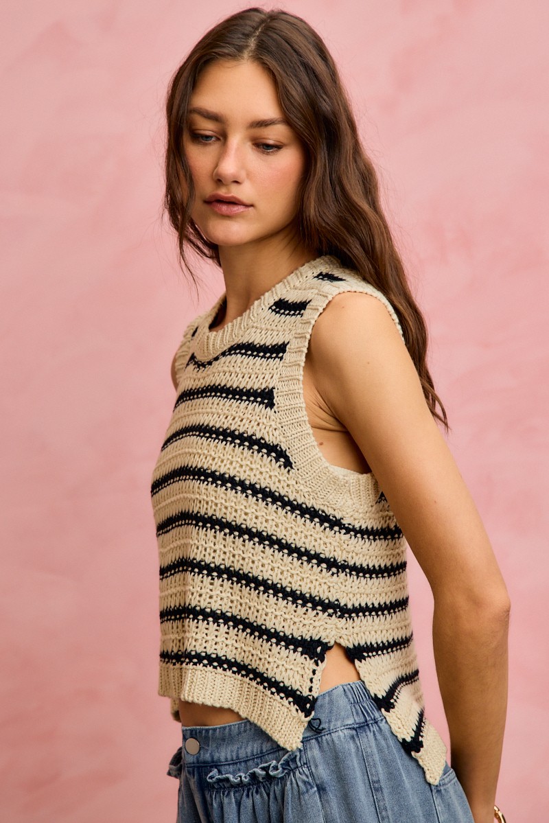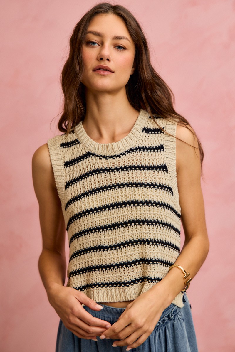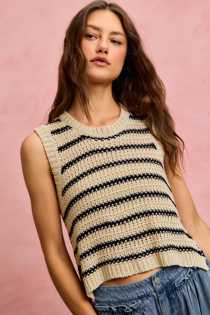 The low gauge textured stripe sleeveless sweater top is a modern and stylish wardrobe essential. Featuring a unique textured stripe design, this top adds interest and dimension to any outfit. The sleeveless silhouette makes it perfect for layering or wearing on its own in warmer weather. Pair it with jeans or trousers for a casual yet chic look, or dress it up with a skirt and heels for a more polished ensemble. Versatile and on-trend, this sweater top is a must-have for any fashion-forward individual.
