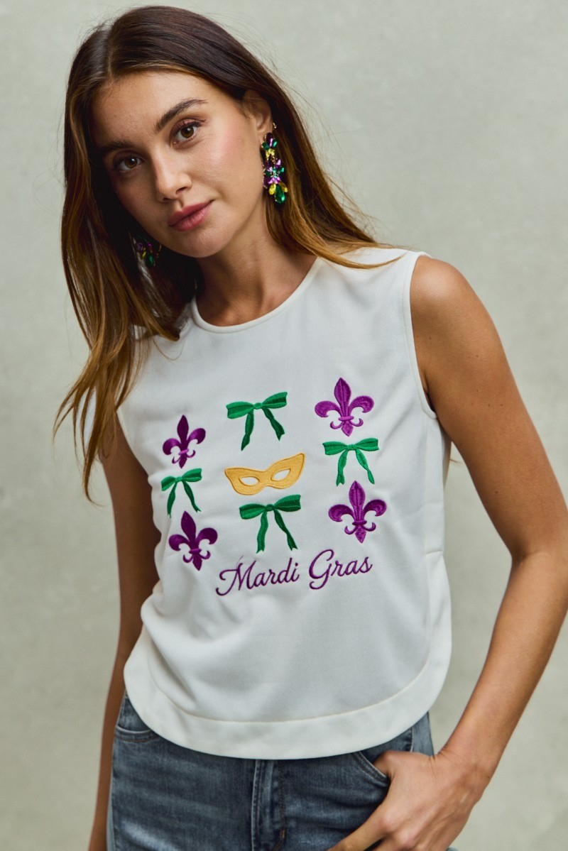 Celebrate Mardi Gras in style with the festive Mardi Gras Fleur De Lis and Ribbon Embroidered Top. This top features intricate embroidery of Fleur De Lis and ribbons, capturing the essence of the holiday spirit. The lightweight and comfortable fabric ensures a stylish and comfortable wear during Mardi Gras festivities. Stand out with the unique and eye-catching design of this embroidered top at your Mardi Gras celebrations. Embrace the festive vibes and add a touch of flair to your ensemble with this Mardi Gras-themed top.