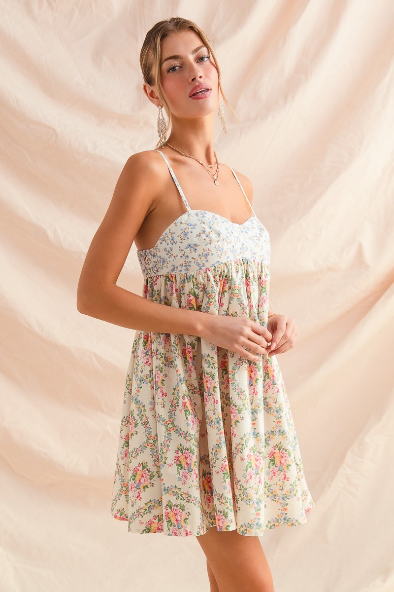 This enchanting floral cami dress features a romantic sweetheart neckline adorned with delicate lace trim and adjustable spaghetti straps for the perfect fit. The empire waist design creates a flattering silhouette while the flowing A-line cut provides comfortable movement. Made from lightweight, breathable fabric with a charming vintage-inspired floral print in soft pastel tones. The knee-length hemline and feminine details make it ideal for summer dates, garden parties, or casual outings. The combination of lace accents and floral pattern creates a dreamy, romantic aesthetic that's both timeless and fashion.