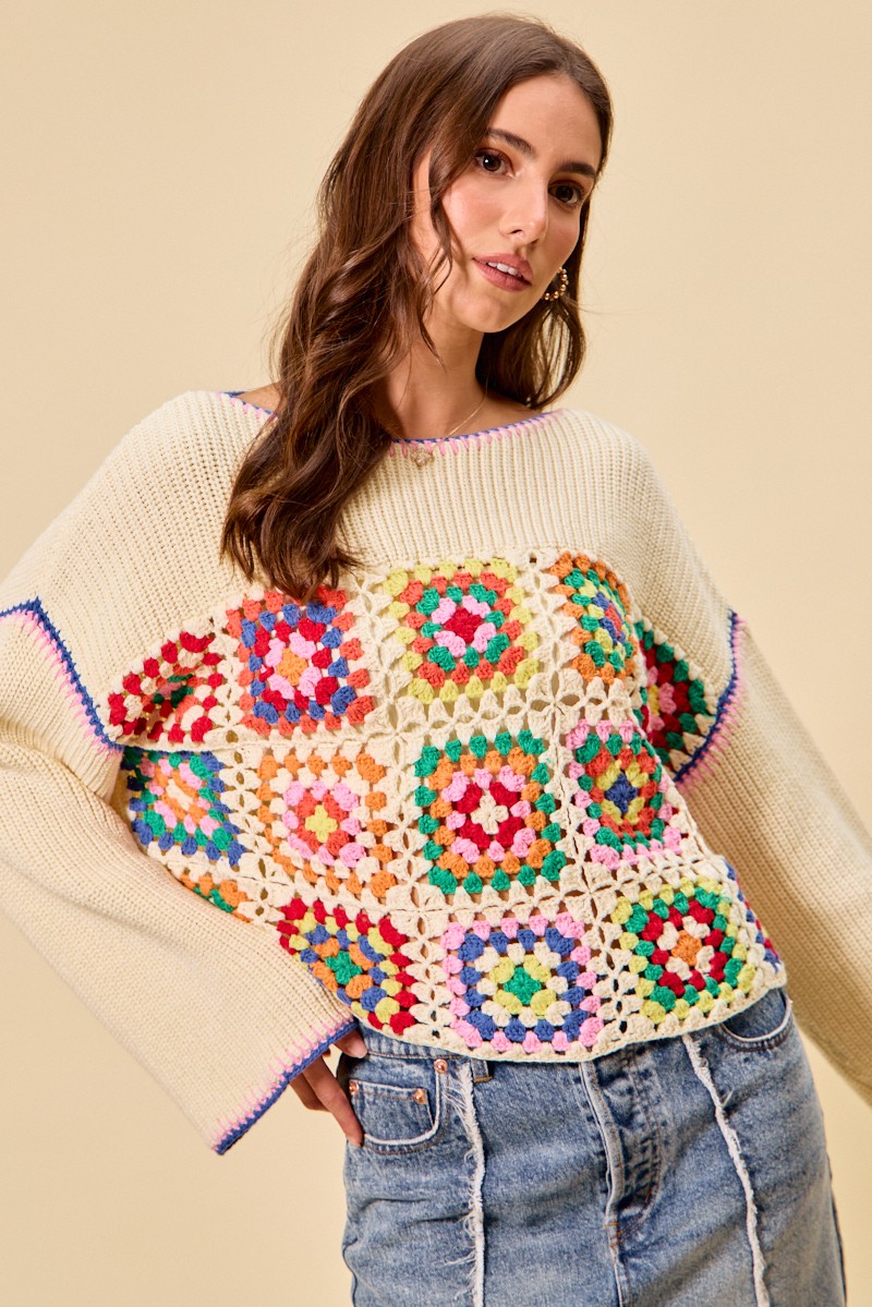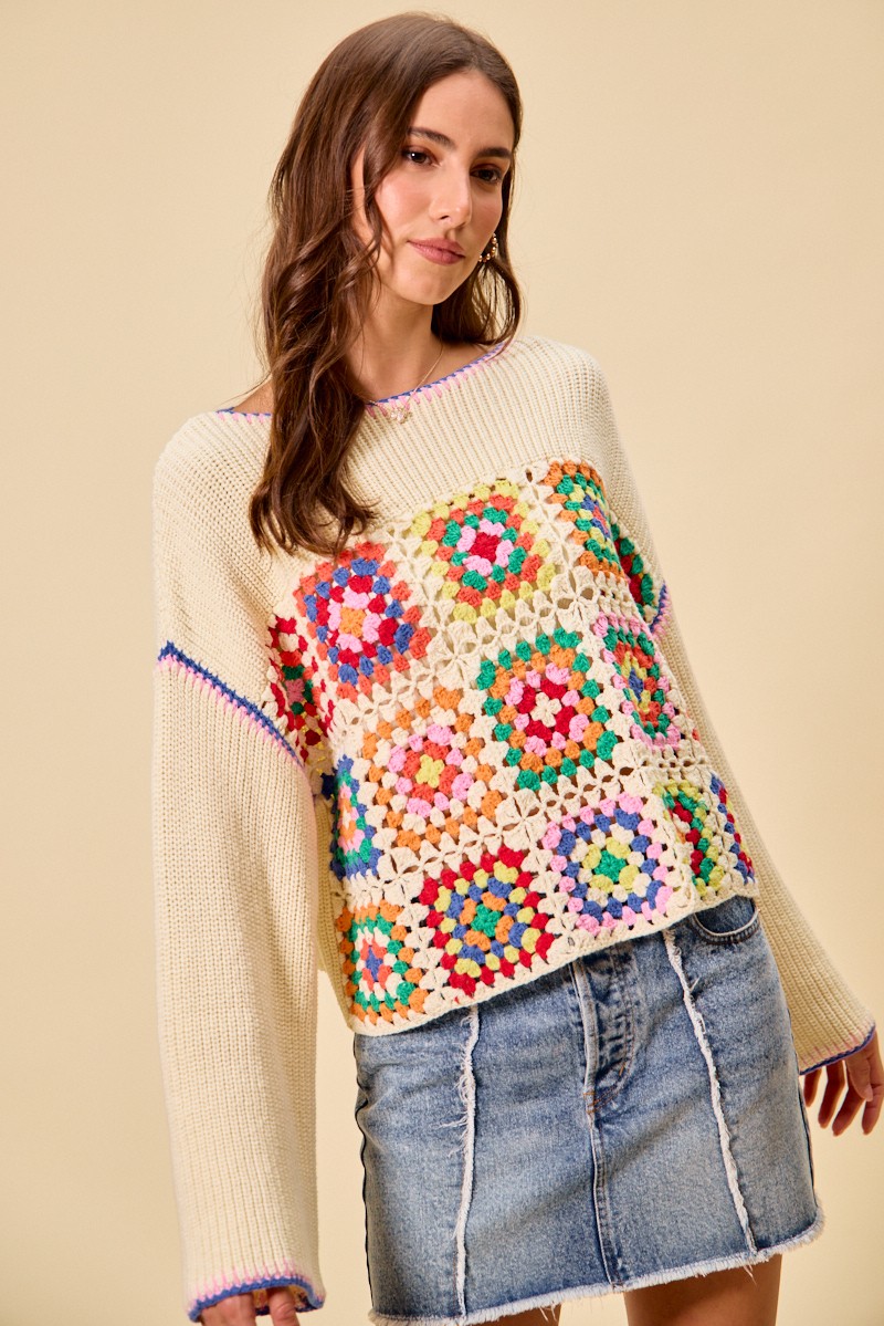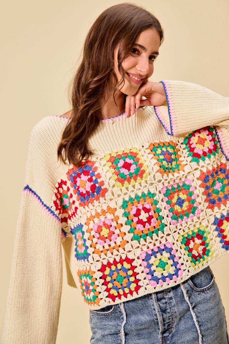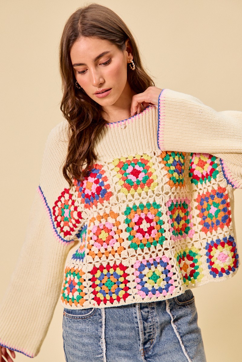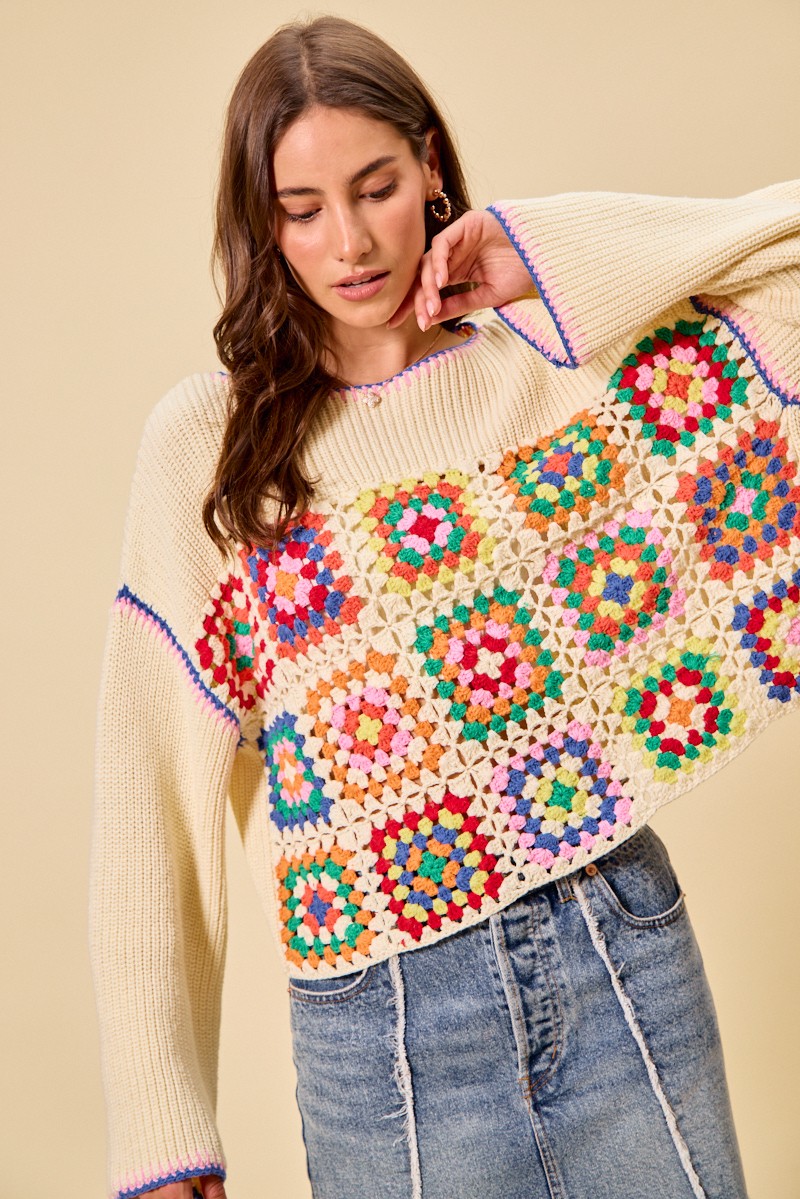 This Multi Color Granny Crochet Lace Sweater Top showcases vibrant multicolor crochet and delicate lace trim for a boho vintage style. It features classic granny square patterns that bring unique texture and charm. Made with soft, breathable fabric, it ensures comfortable daily wear. The versatile design pairs perfectly with jeans, skirts or shorts for effortless styling.