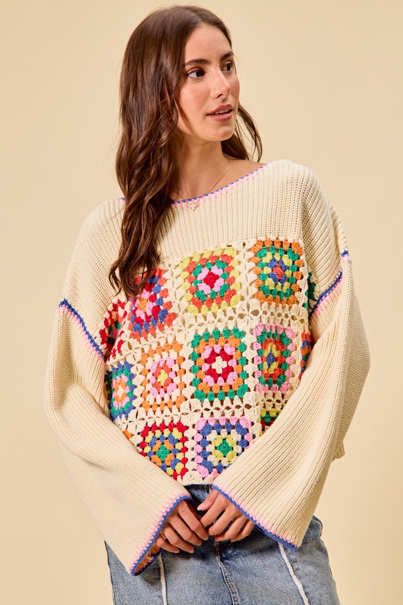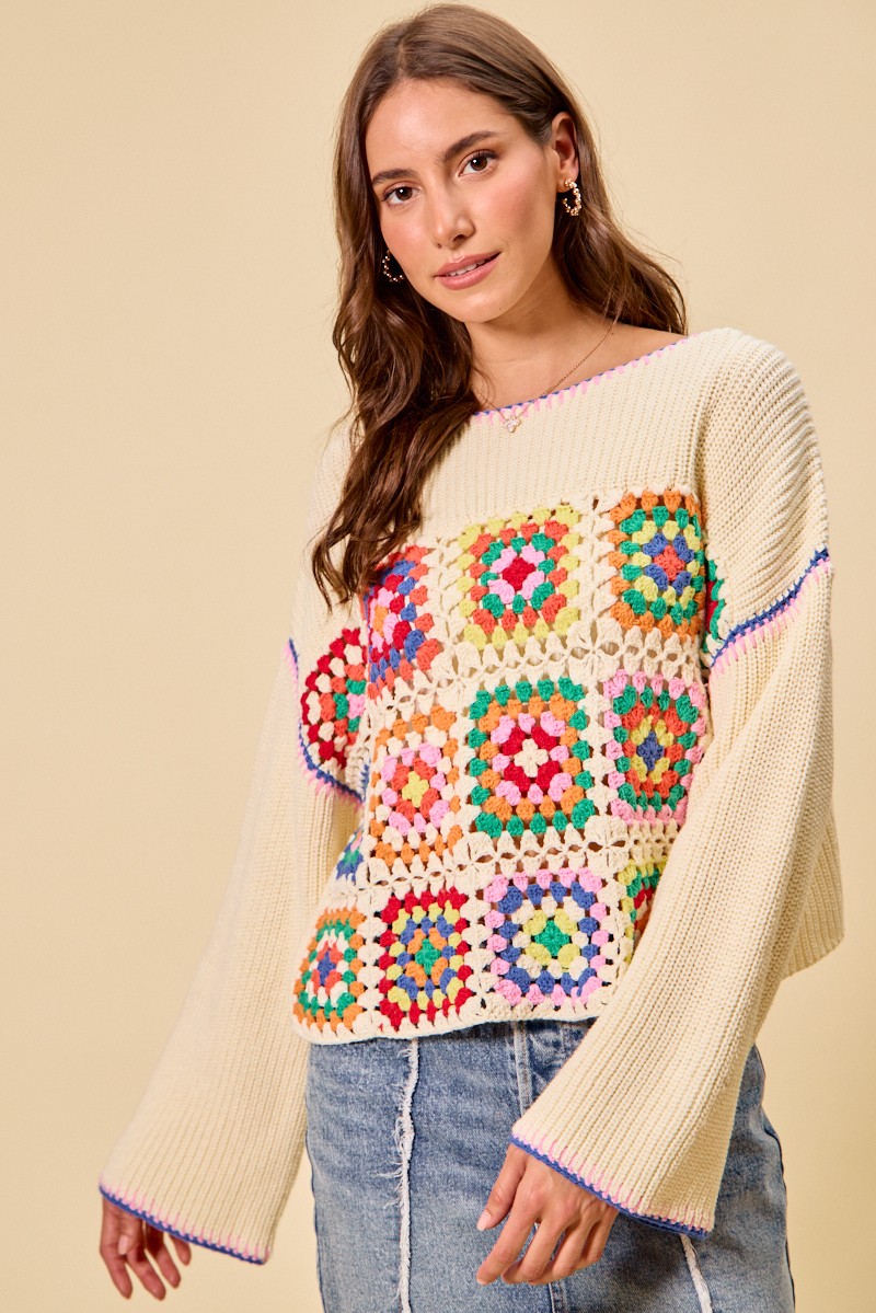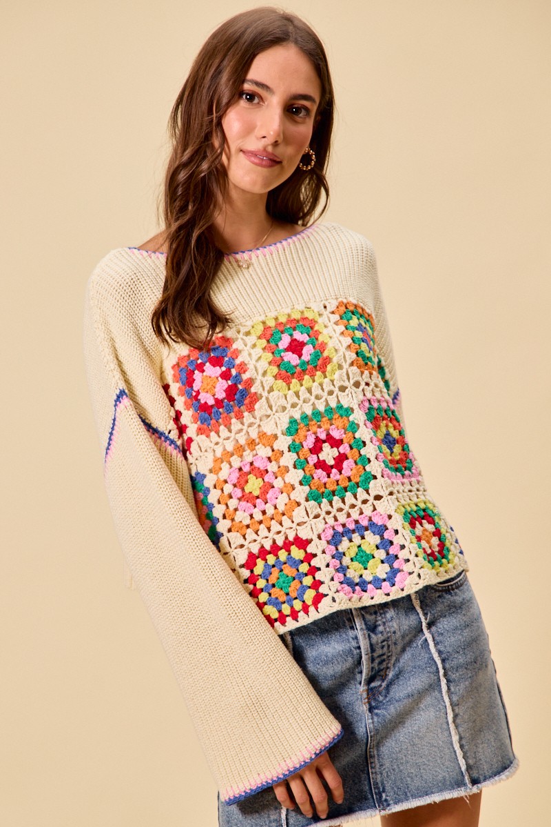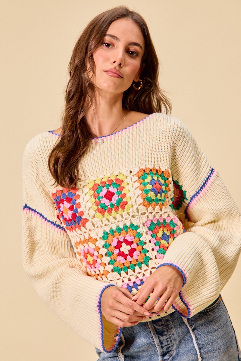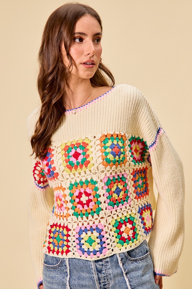 This Multi Color Granny Crochet Lace Sweater Top showcases vibrant multicolor crochet and delicate lace trim for a boho vintage style. It features classic granny square patterns that bring unique texture and charm. Made with soft, breathable fabric, it ensures comfortable daily wear. The versatile design pairs perfectly with jeans, skirts or shorts for effortless styling.