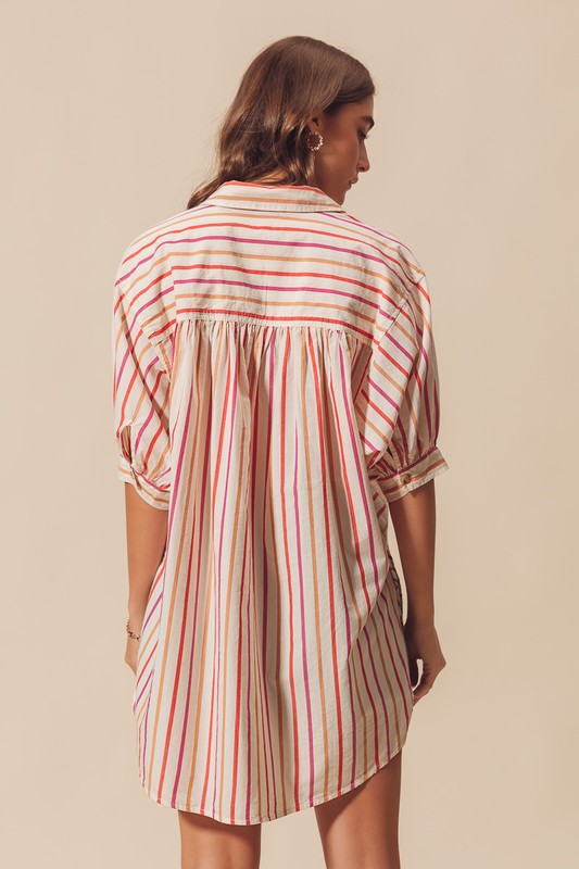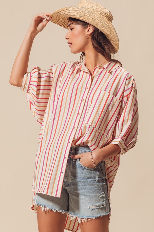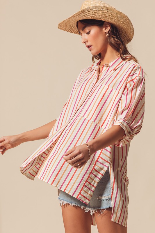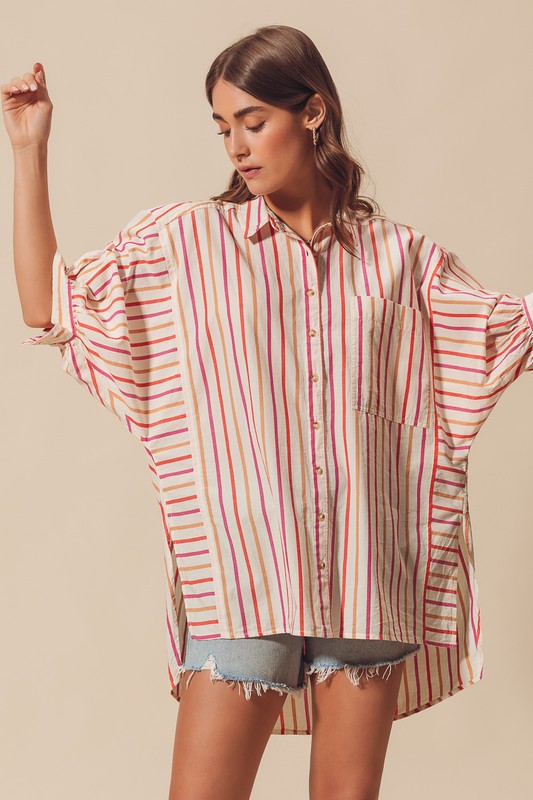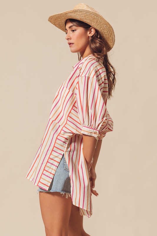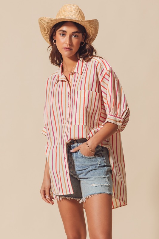 The multicolored stripe button down shirt features a vibrant and eye-catching design. This versatile piece can easily be dressed up for a more formal look or dressed down for a casual outing. The playful combination of colors adds a fun and stylish touch to any outfit. Perfect for adding a pop of color and personality to your wardrobe.