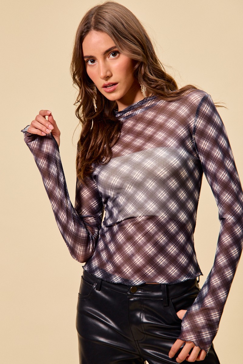 The Plaid Mesh Knit Long Sleeve Top with Thumb Opening combines a classic plaid pattern with a modern mesh knit design for a stylish look. This top features long sleeves with thumb openings for added comfort and a trendy twist. The mesh knit material adds a touch of texture and visual interest to the plaid pattern. Stay cozy and on-trend with this unique top that offers both style and functionality. Elevate your winter wardrobe with this plaid mesh knit top featuring thumb openings, perfect for adding a touch of edge to your outfit.