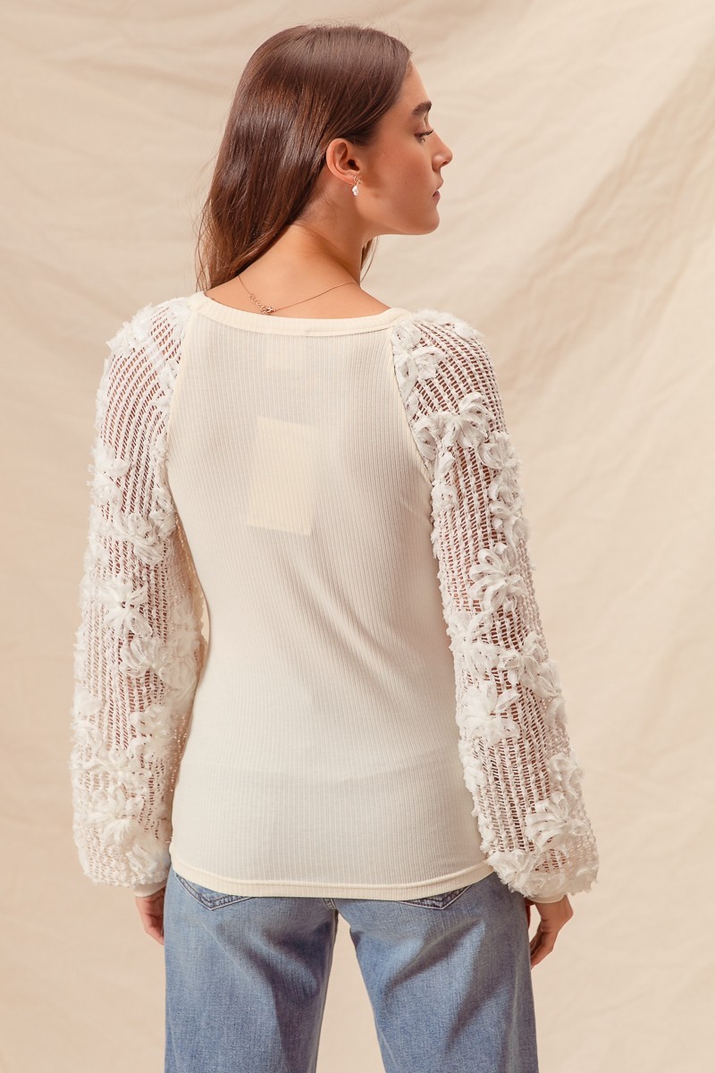 This blouse features delicate floral lace sleeves that add a touch of elegance to the ribbed knit bodice. The round neckline and long balloon sleeves create a flattering silhouette. Made from a soft and comfortable material, this blouse is perfect for layering and can be dressed up or down for any occasion. The fitted bodice accentuates the waist, while the lightweight fabric ensures all-day comfort. Ideal for adding a chic and sophisticated touch to your wardrobe.