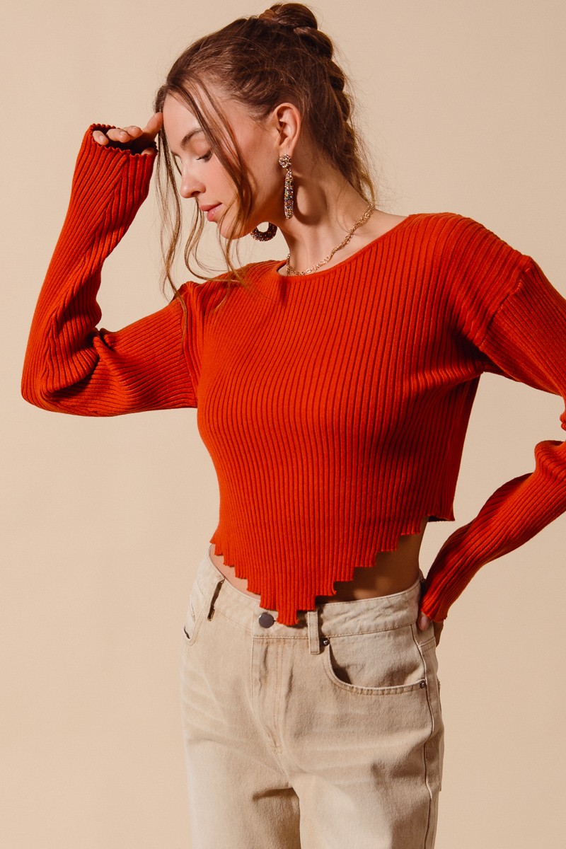 This rib-knitted crop sweater top features a trendy shaped hem for a modern twist on a classic style. The ribbed knit adds texture and visual interest to the design. Perfect for layering or wearing on its own, this crop top is versatile for various outfits. The shaped hem adds a unique and flattering detail to the top. Pair this stylish sweater top with high-waisted bottoms for a chic and fashion-forward look.