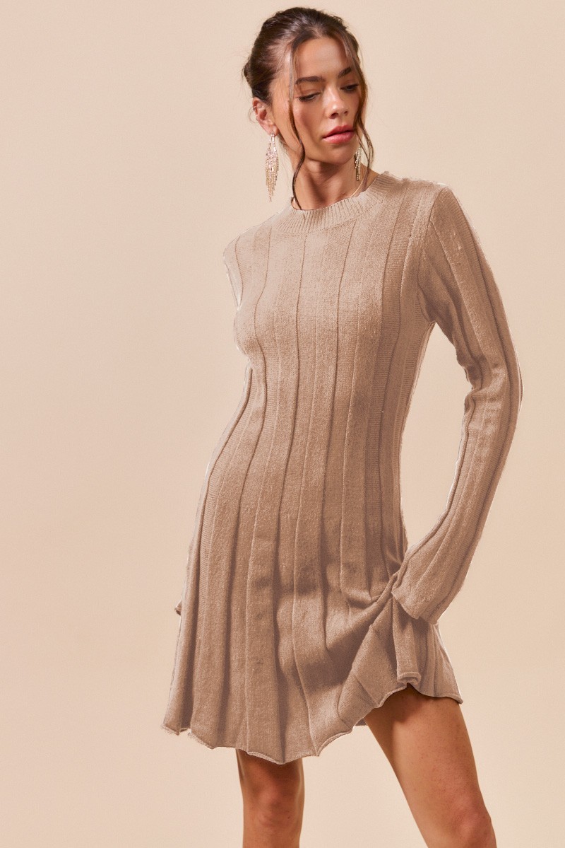 Stay cozy and stylish in this Ribbed Long Sleeve Mini Sweater Dress. The ribbed design adds texture and dimension to the dress. The long sleeves provide warmth and comfort, perfect for cooler weather. The mini length gives it a chic and trendy look. Pair it with boots or heels for a versatile outfit that can easily transition from day to night. A must-have piece for a fashionable and comfortable wardrobe.