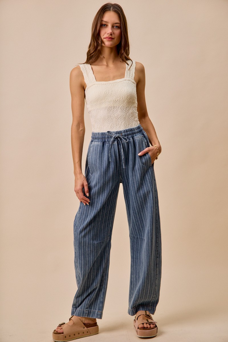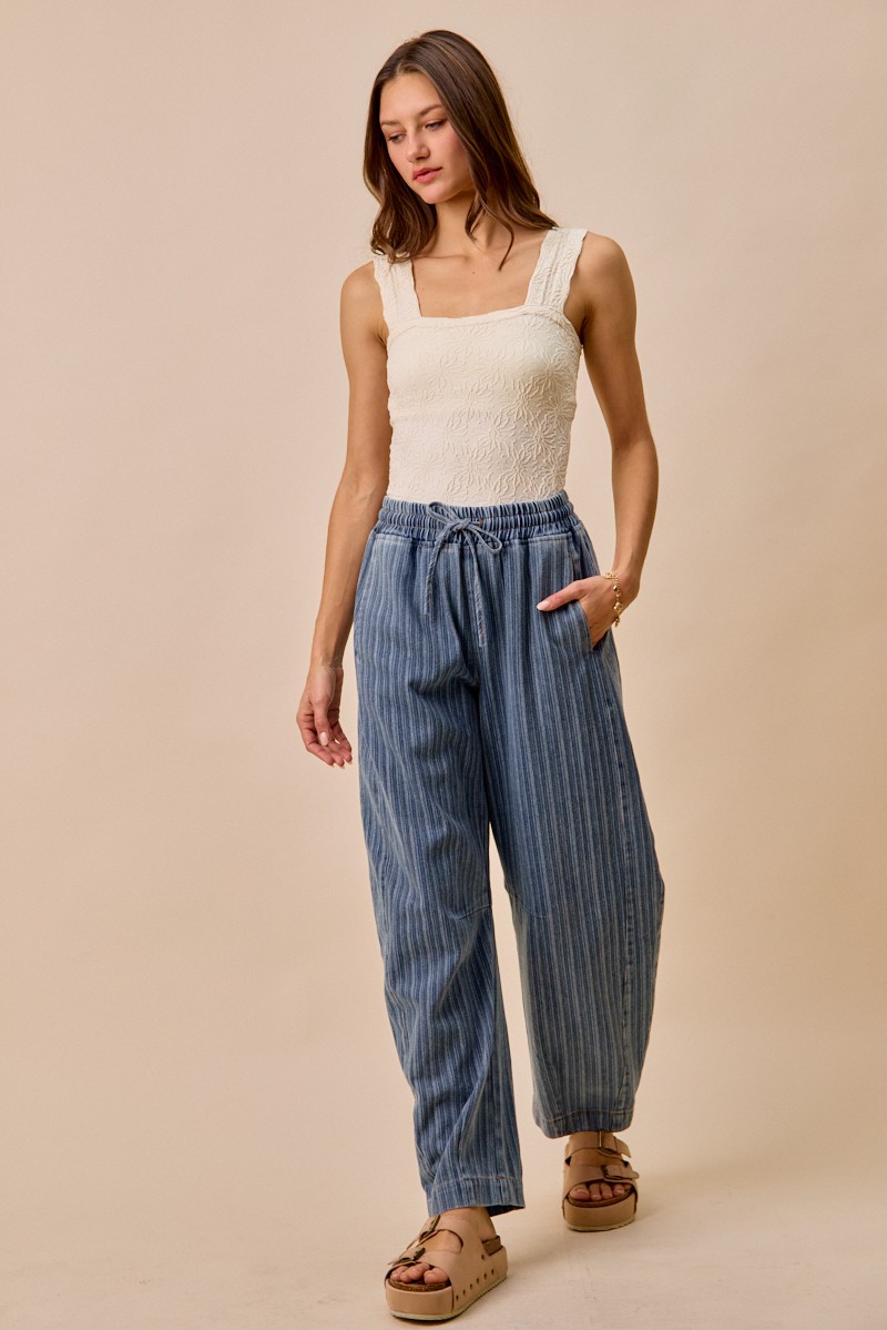 The Stripe Denim Barrel Jeans with a drawstring waistband offer a modern twist on classic denim. The stylish stripe pattern adds a pop of interest to your outfit. The drawstring waistband provides a comfortable and adjustable fit. These jeans are perfect for a casual yet fashionable look. Elevate your wardrobe with this unique and versatile piece.