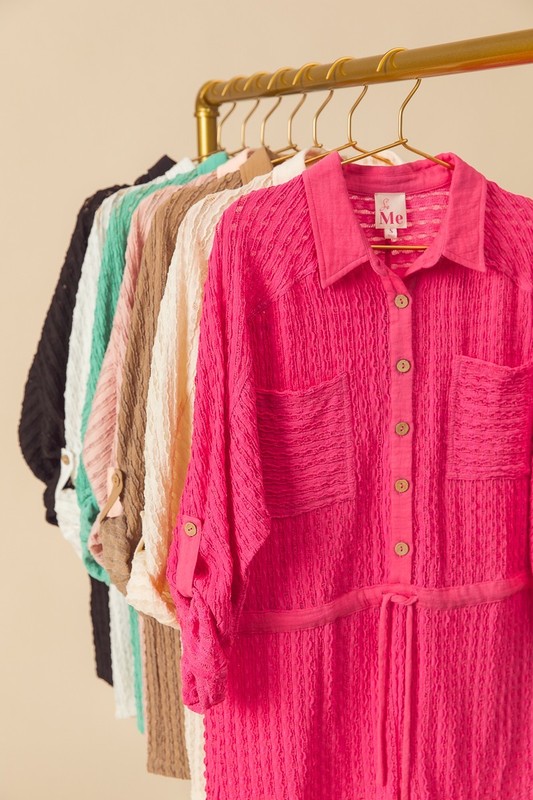 Elevate your summer wardrobe with this Textured Knit Button Front Romper. The textured knit adds depth and interest to the romper, creating a stylish look. The button front detail offers a chic and trendy touch to the design. Perfect for warm-weather occasions, this romper combines comfort and fashion. Stay effortlessly stylish and cool with this versatile and on-trend piece in your closet.