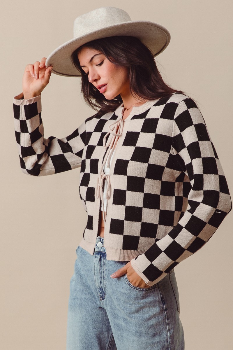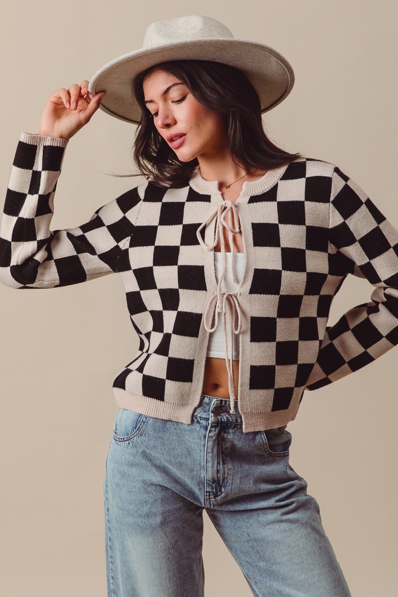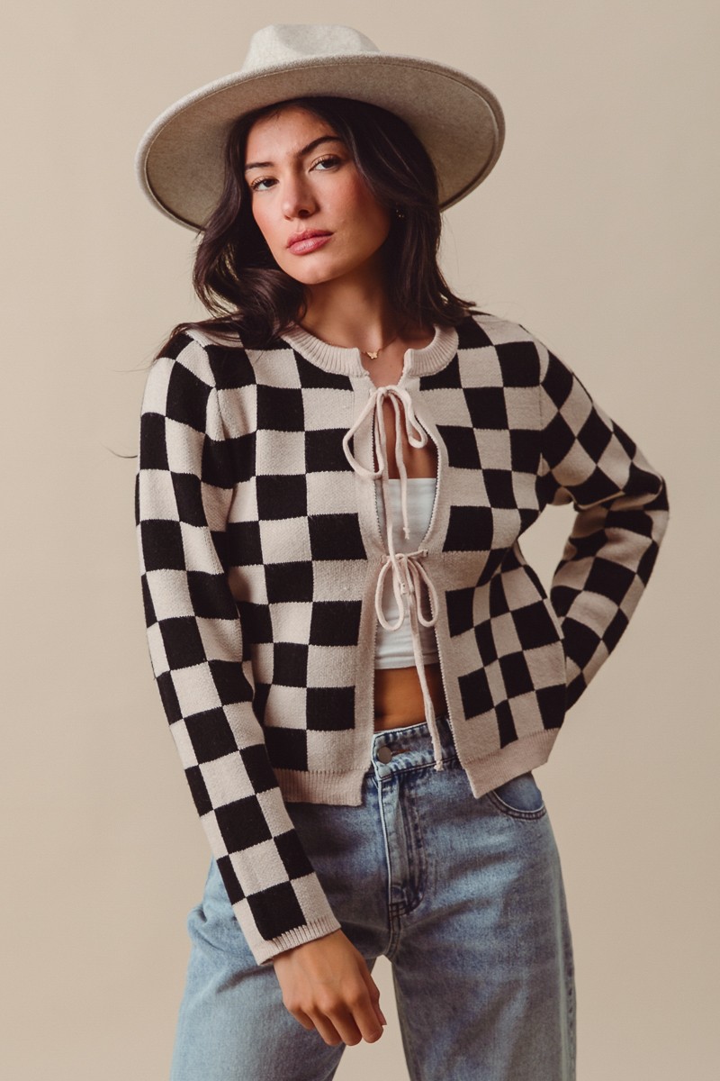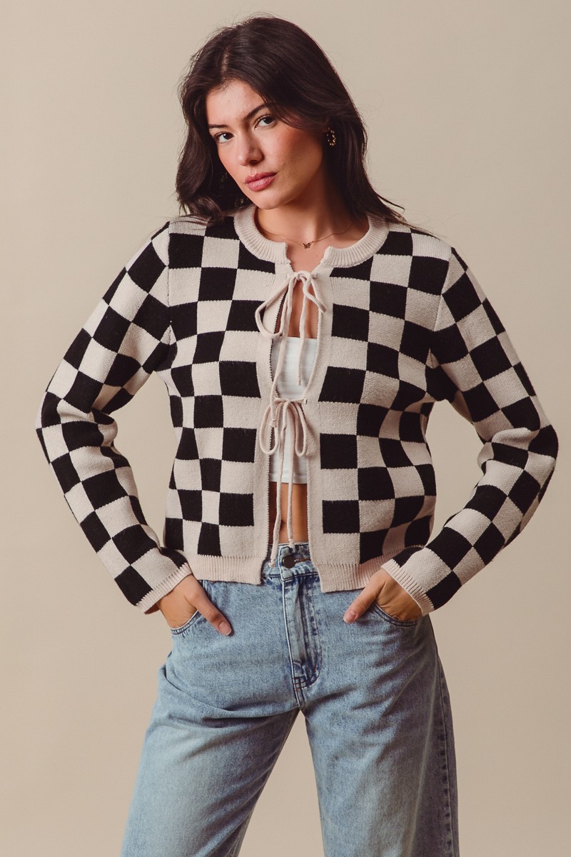Elevate your winter wardrobe with this Tie Front Checkered Knitted Round Neck Cardigan. The checkered pattern adds a classic and timeless element to this cozy cardigan. Featuring a tie front detail, it offers a chic and flattering silhouette. Made from knitted fabric, this cardigan is soft and warm for cooler days. Pair it with a basic top and jeans for a stylish and comfortable ensemble that will keep you looking fashionable all season long.