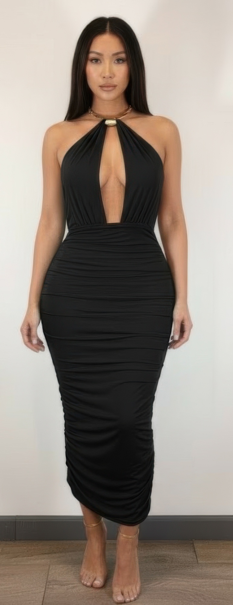 Sleek and statement-making, this strapless midi dress is designed to elevate any evening look. The neckline is adorned with an integrated necklace-style detail, adding a hint of shine and built-in elegance. The open back introduces a bold, modern element that balances the clean lines of the strapless bodice. Made from a smooth, stretch-blend fabric, the dress hugs the body with a refined, sculpted fit. With its midi length and striking design, it’s a standout choice for special occasions and sophisticated nights out.