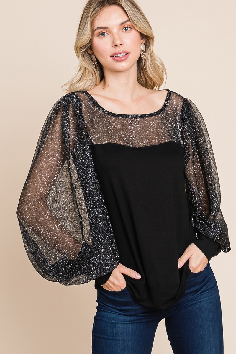 This Metallic Mesh Lantern Sleeve Blouse is a stylish and trendy top that features a metallic mesh fabric, giving it a unique and eye-catching look. The lantern sleeves add a touch of femininity and sophistication to the blouse. Perfect for both casual and formal occasions, this blouse can be dressed up or down to suit any outfit. Add a touch of glamour to your wardrobe with this stunning Metallic Mesh Lantern Sleeve Blouse.