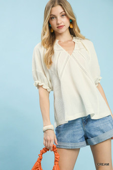 Choose Options Umgee Textured Lace Trim V-Neck Boho Blouse MSRP: Was: Now: $52.47 This Textured Lace Trim V-Neck Boho Blouse features a textured crinkle design and V-neck with delica…
