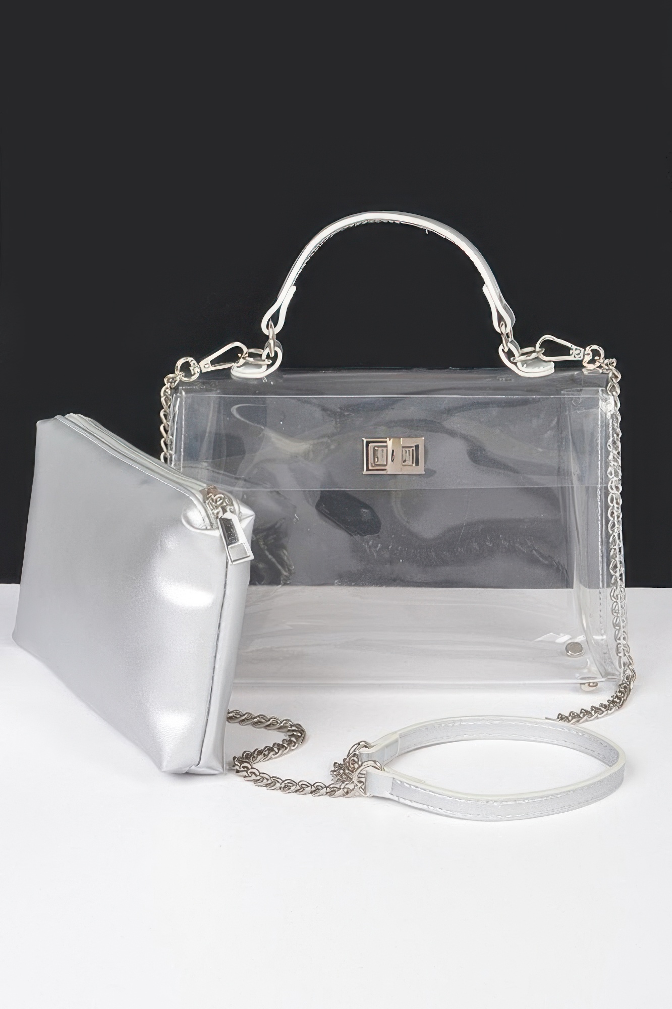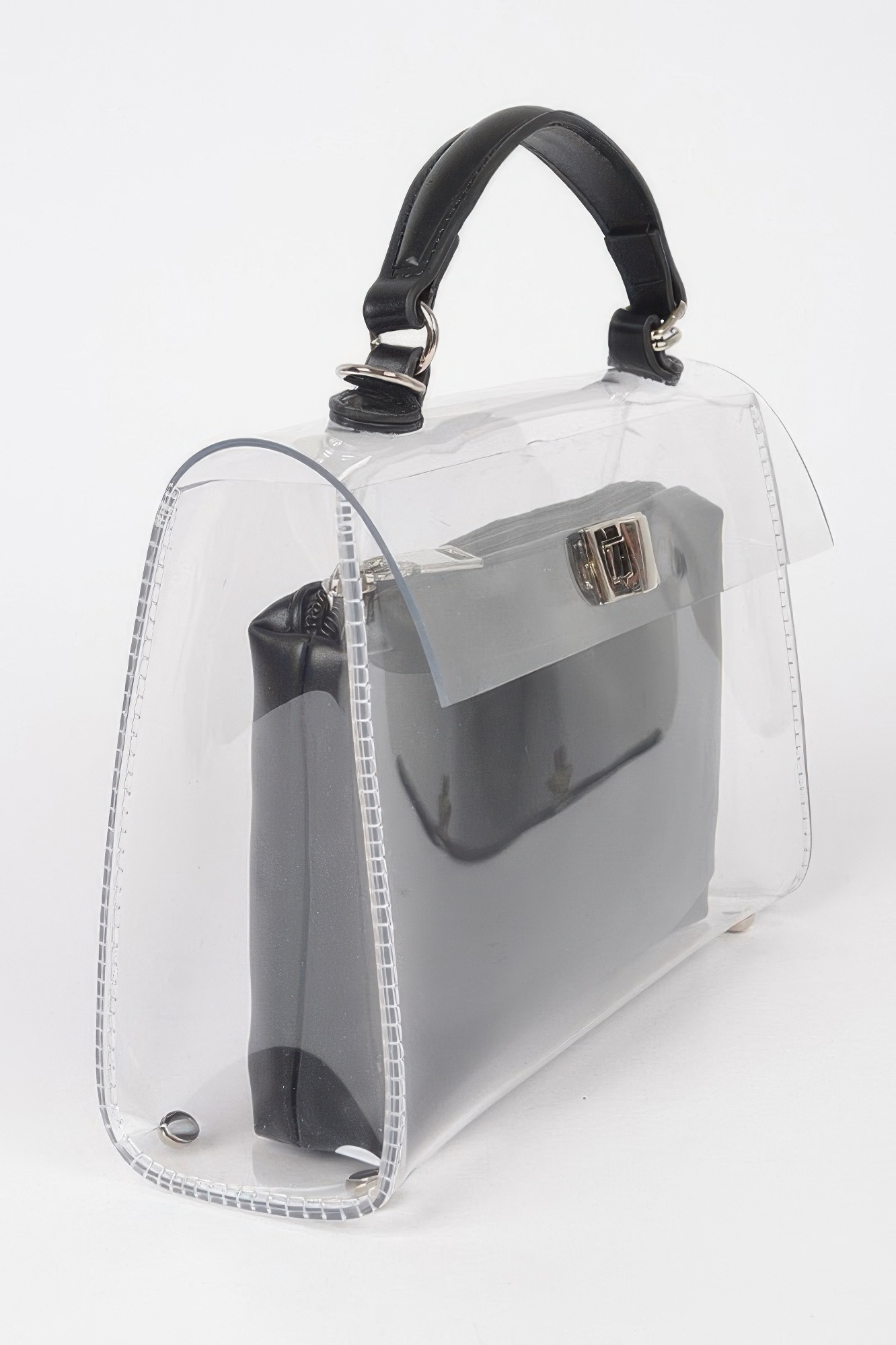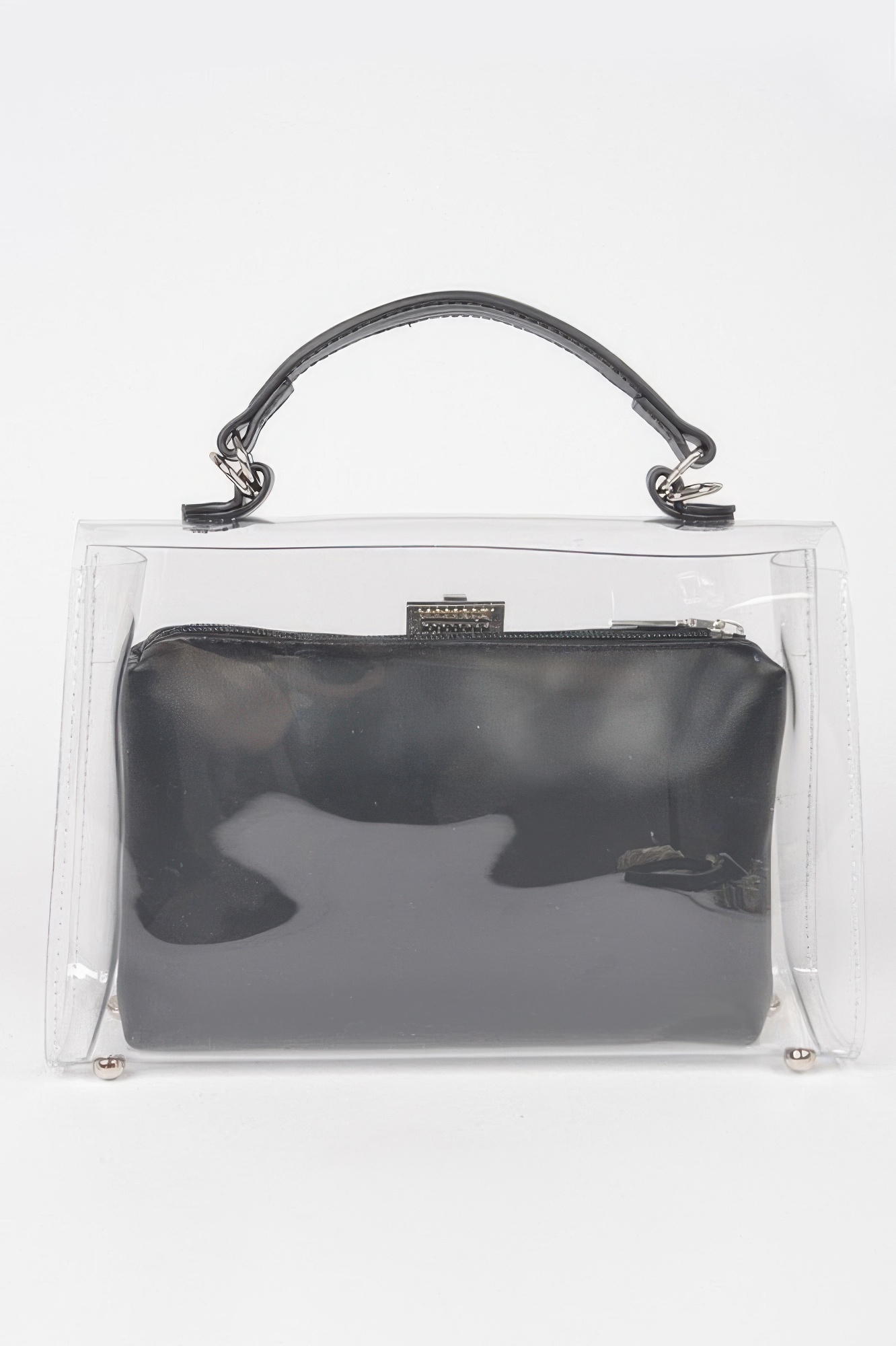 This transparent top handle flap bag offers a modern, fashion-forward look with practical versatility. Designed with a structured silhouette, it features a removable inner pouch for added privacy and organization. The clear exterior creates a sleek, contemporary statement while maintaining everyday functionality. Finished with mixed metal hardware, it balances bold design with refined detail. Perfect for events, concerts, or standout street style moments.