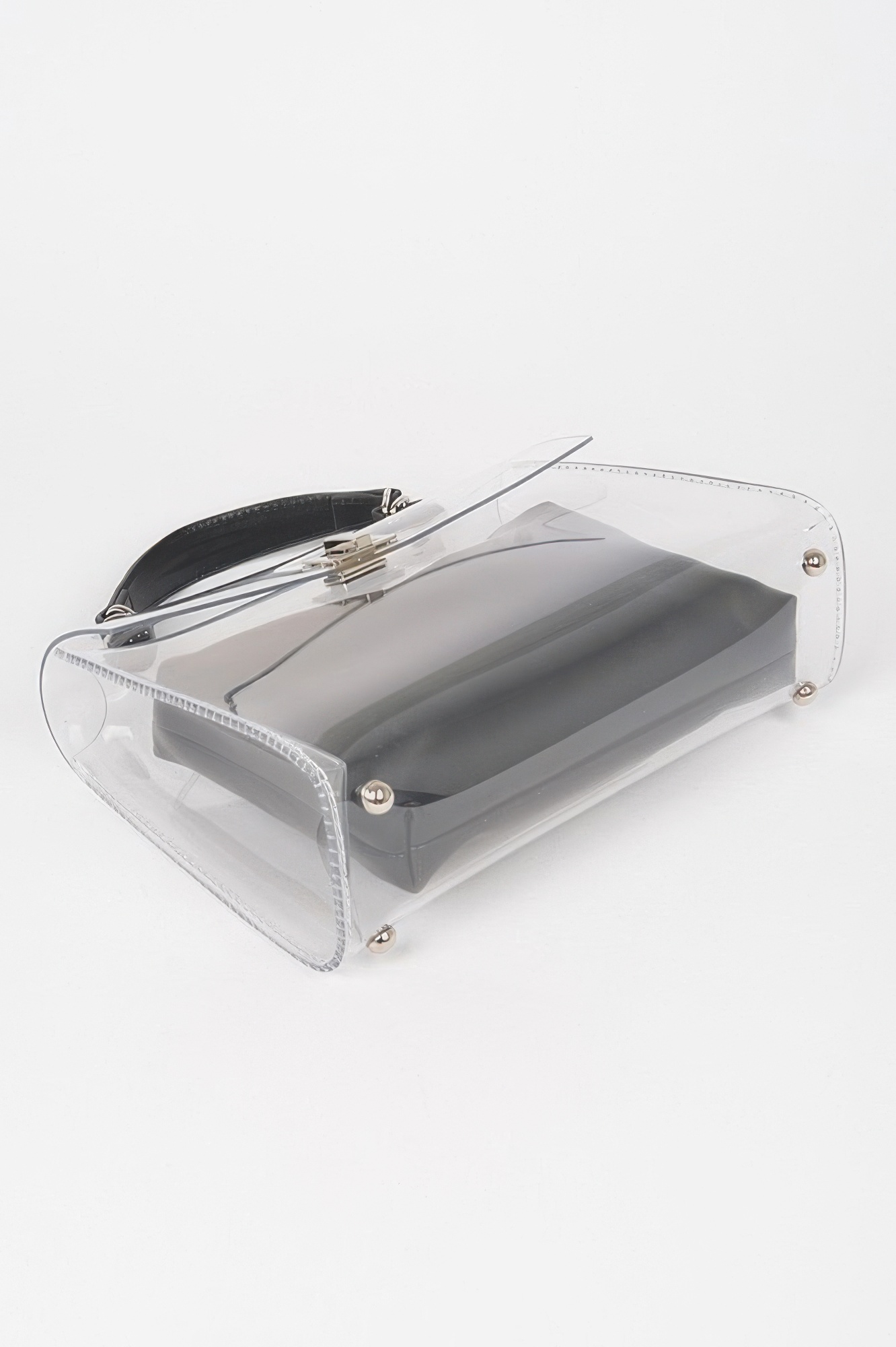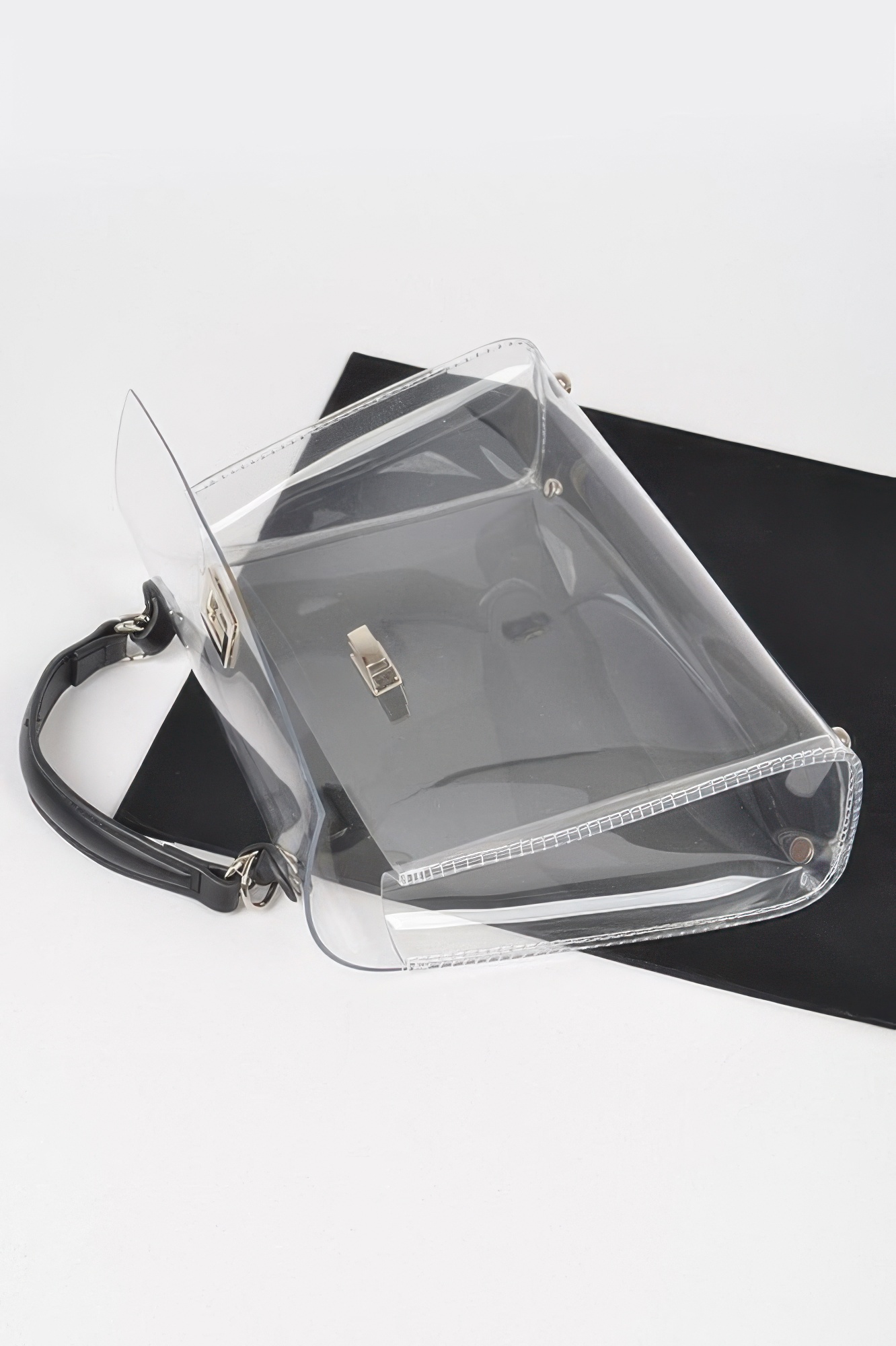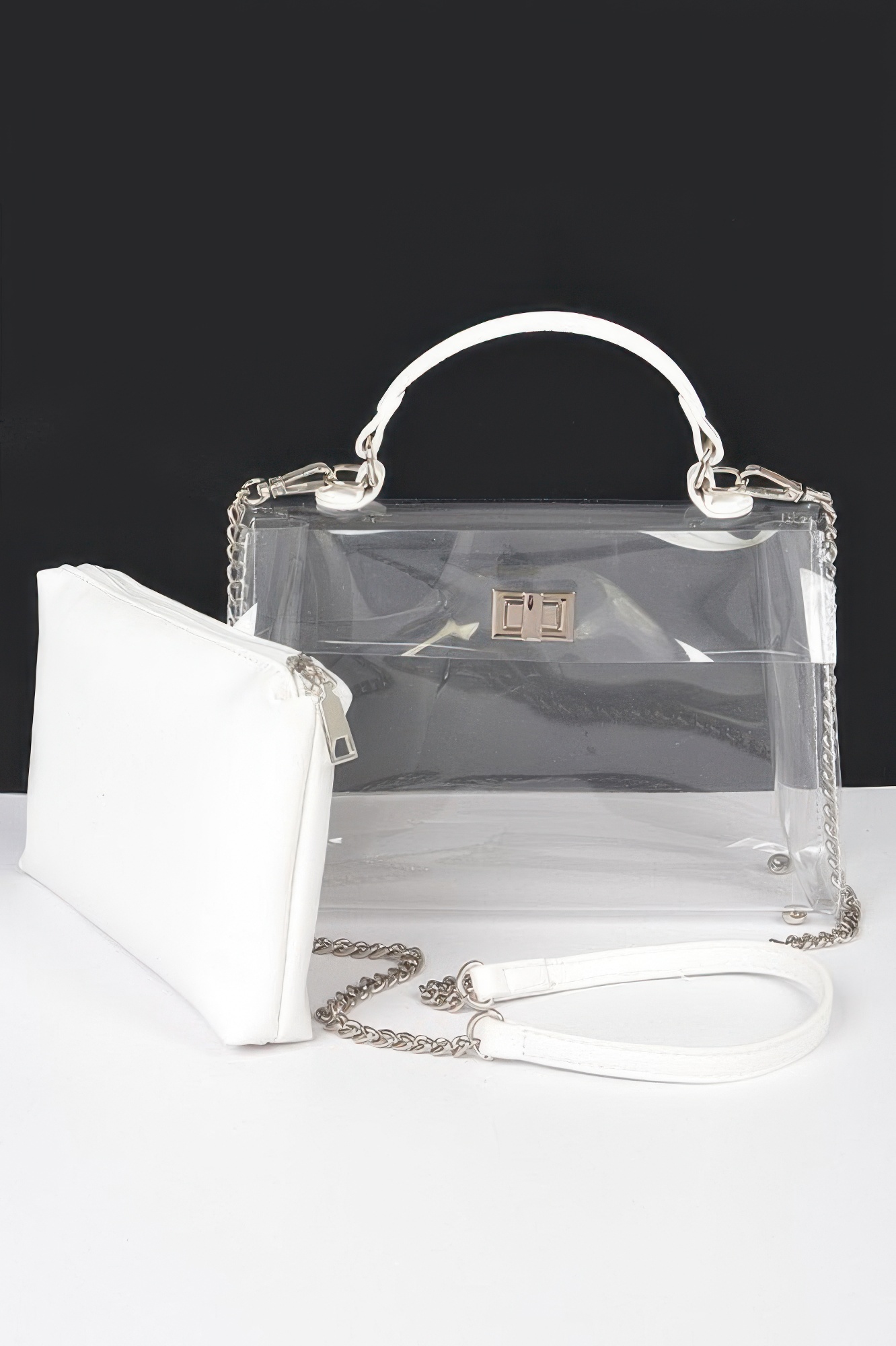This transparent top handle flap bag offers a modern, fashion-forward look with practical versatility. Designed with a structured silhouette, it features a removable inner pouch for added privacy and organization. The clear exterior creates a sleek, contemporary statement while maintaining everyday functionality. Finished with mixed metal hardware, it balances bold design with refined detail. Perfect for events, concerts, or standout street style moments.