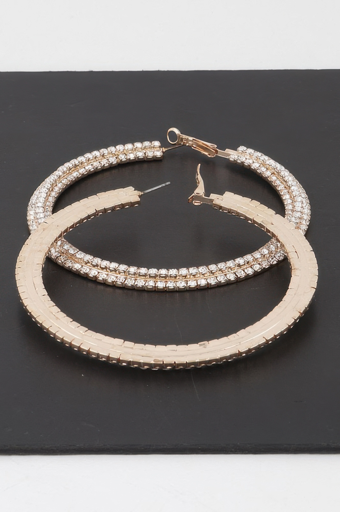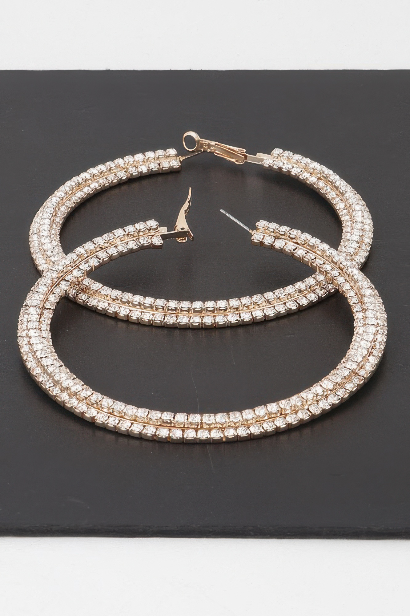 Make a statement with these triple jeweled flat hoop earrings. Designed with oversized hoops and encrusted detailing, they add just the right touch of glam. Whether paired with sleek eveningwear or dressed-down denim, they deliver eye-catching sparkle with elevated edge.