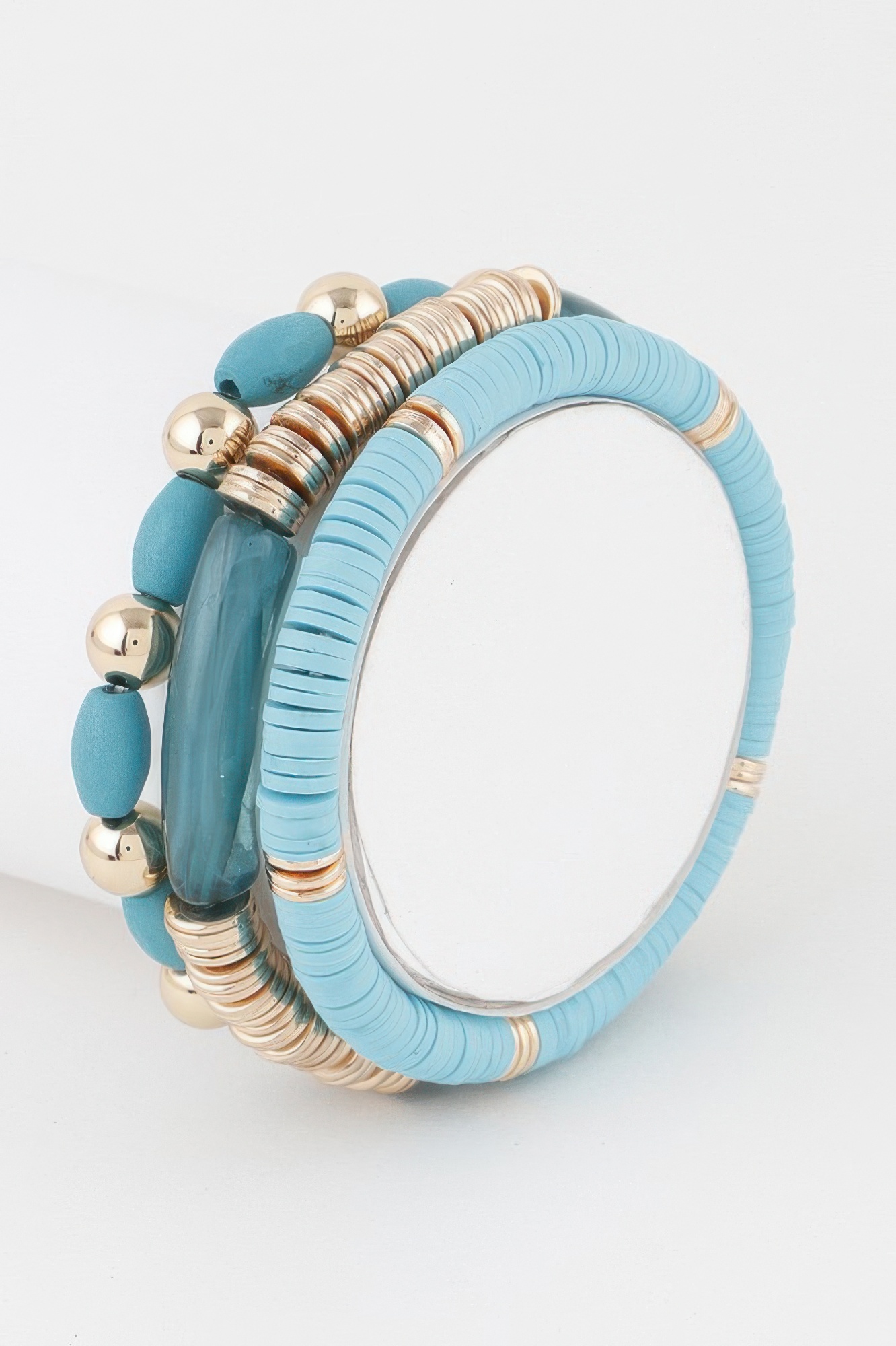 The Triple Layered Bead Bracelet offers a stylish combination of texture and layered design. Featuring three rows of decorative beads, this bracelet creates a full and eye catching look that enhances any outfit. The layered construction adds dimension and visual interest while maintaining a comfortable fit. Its versatile design makes it suitable for both casual and dressy styling. The beads reflect subtle shine, giving the bracelet a polished appearance. Easy to wear alone or stacked with other accessories, it adds depth to any jewelry collection. This bracelet is perfect for everyday styling or adding a stylish accent to special occasion looks.