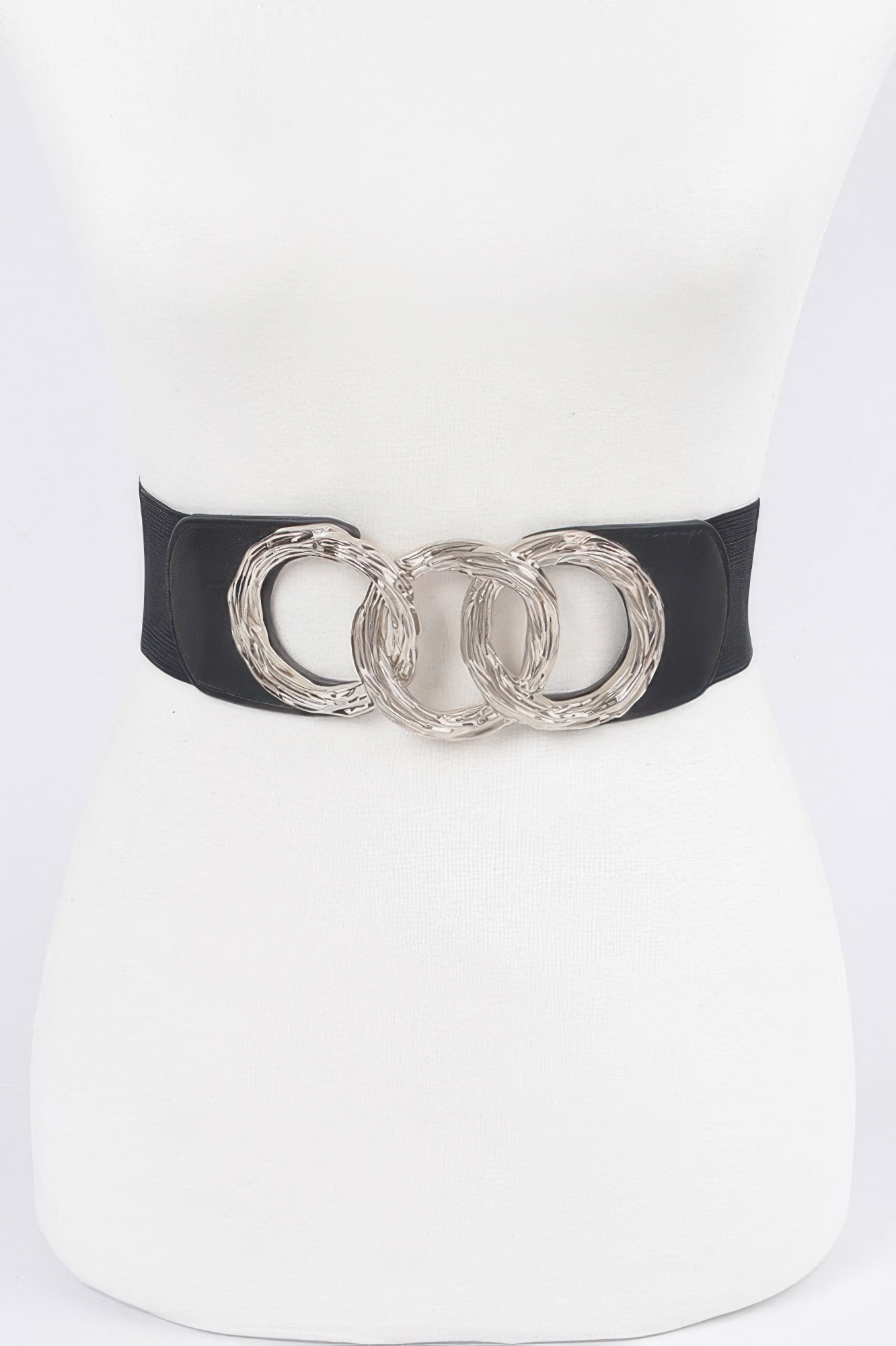 Bold and statement-making, the Triple O Ring Buckle Elastic Belt adds instant definition to any outfit. Featuring three gleaming O-ring buckles across a wide elastic band, this belt creates a flattering, cinched silhouette. The mix of metal and stretch ensures both structure and comfort, making it an ideal accent for dresses, blazers, or oversized tops. A go-to accessory for adding edge and shape with one easy piece.