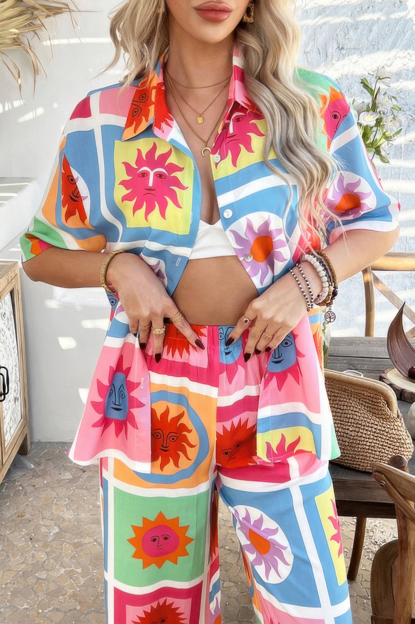 Bold prints meet relaxed sophistication in this two-piece set designed for effortless everyday style. Crafted from a lightweight blend of 30% Tencel and 70% Viscose, it offers a breathable and fluid drape that's perfect for warm days. The button-down top features long sleeves and a classic collar, while the matching bottoms complete the look with a coordinated flair. Whether you're heading to brunch, running errands, or exploring on vacation, this set brings easy elegance and standout appeal to any outing.