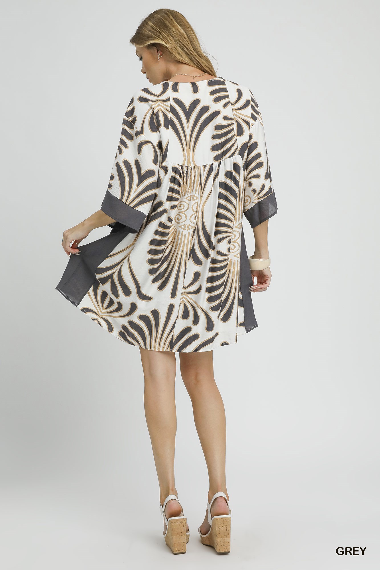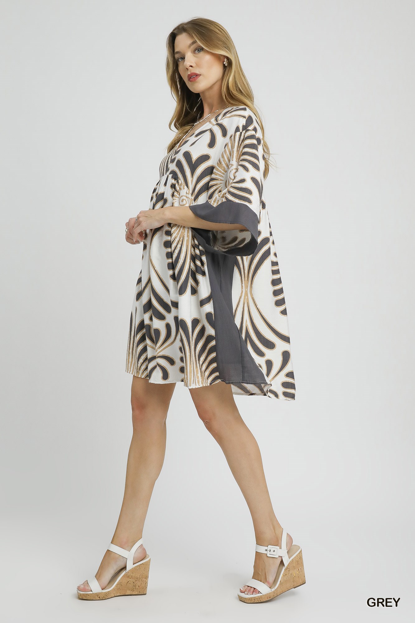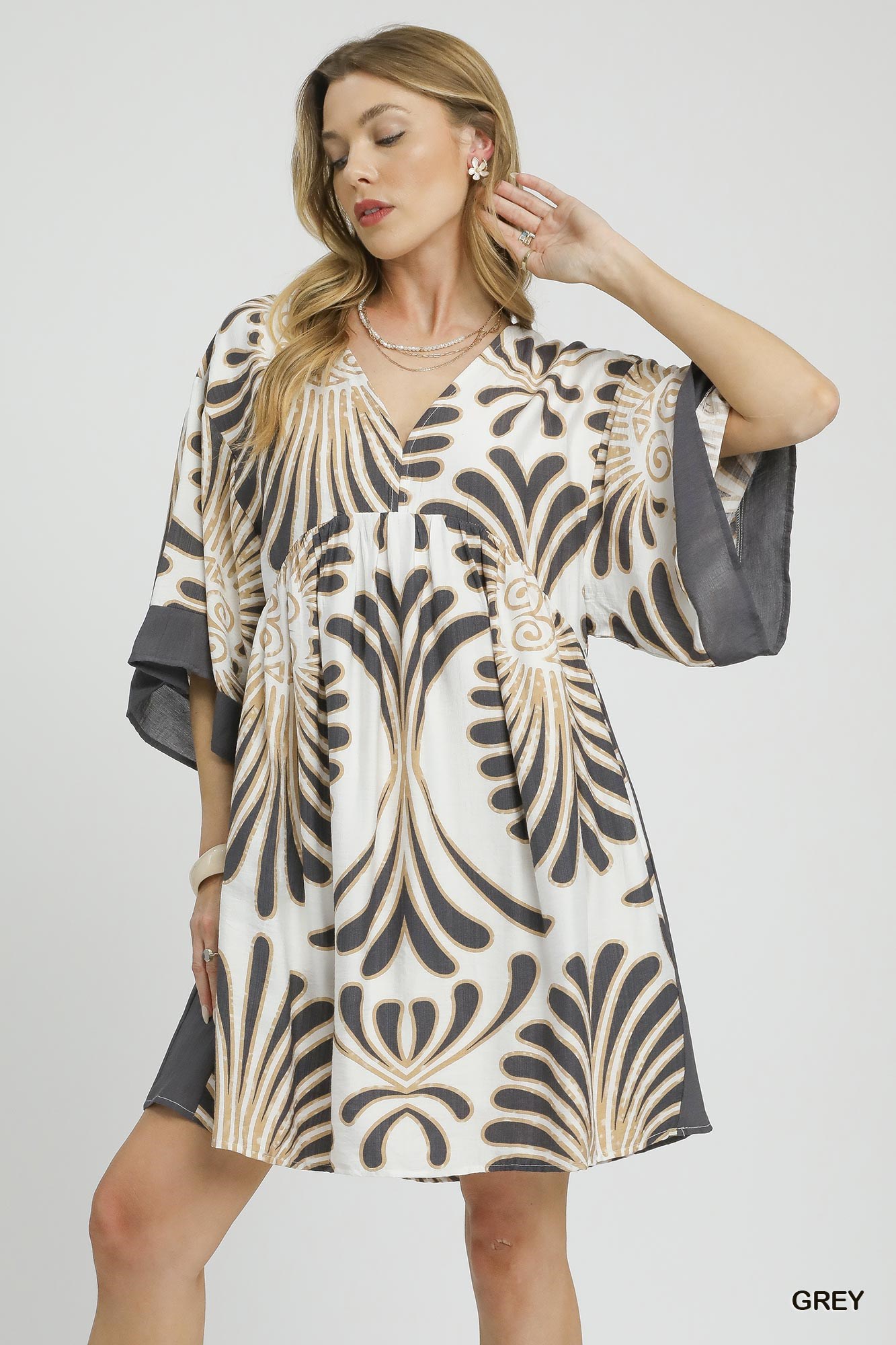 This stunning abstract print dress features a bold geometric pattern in neutral tones of cream, black and brown. The relaxed fit silhouette is enhanced by dramatic kimono sleeves with contrasting dark trim detail. Crafted from soft, flowing fabric that drapes beautifully, this knee-length dress offers both comfort and style. The V neckline and easy pull-on design make it perfect for effortless dressing, while the artistic print adds visual interest and modern flair. Ideal for transitional seasons and versatile enough to dress up or down for various occasions.