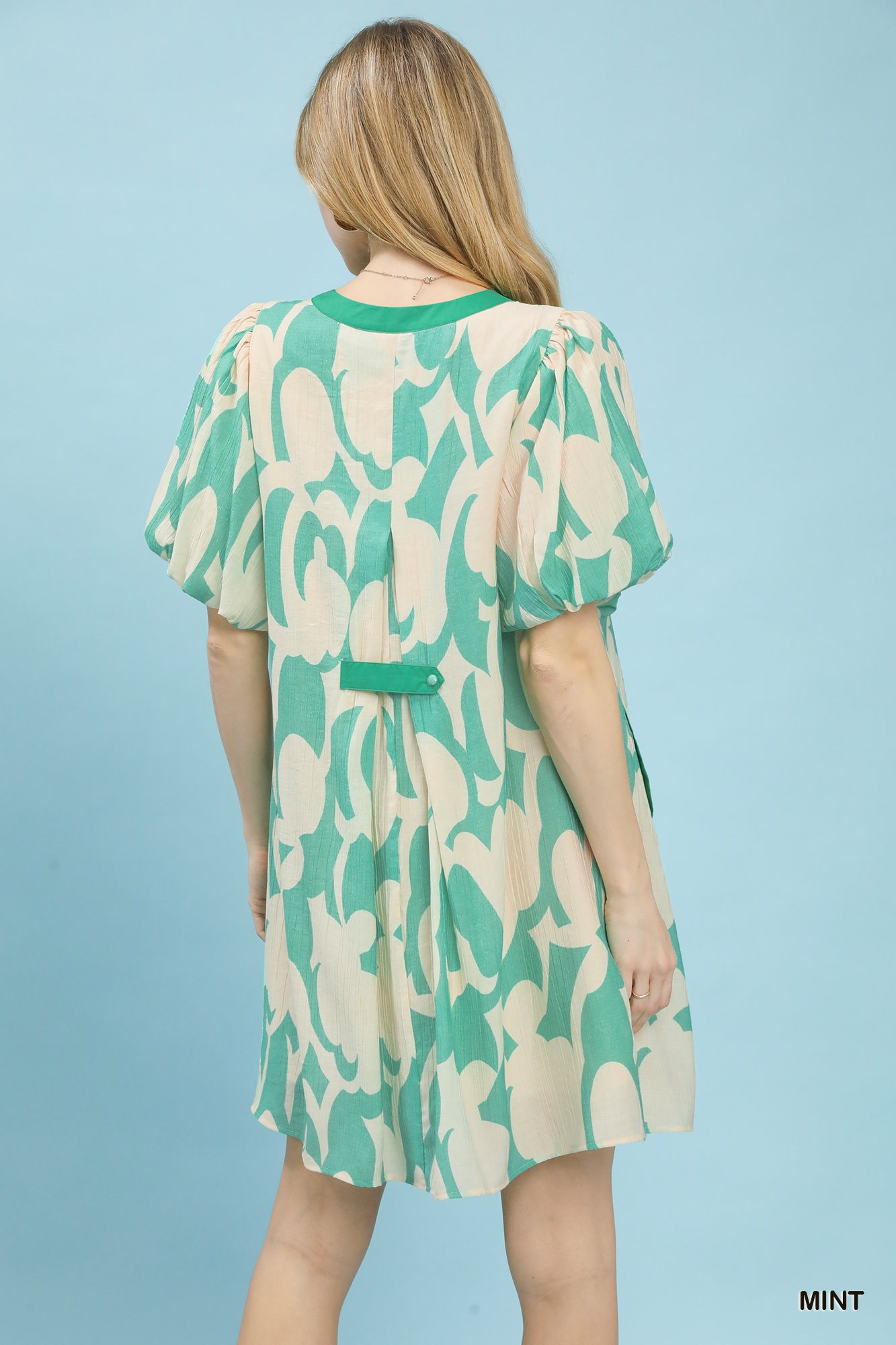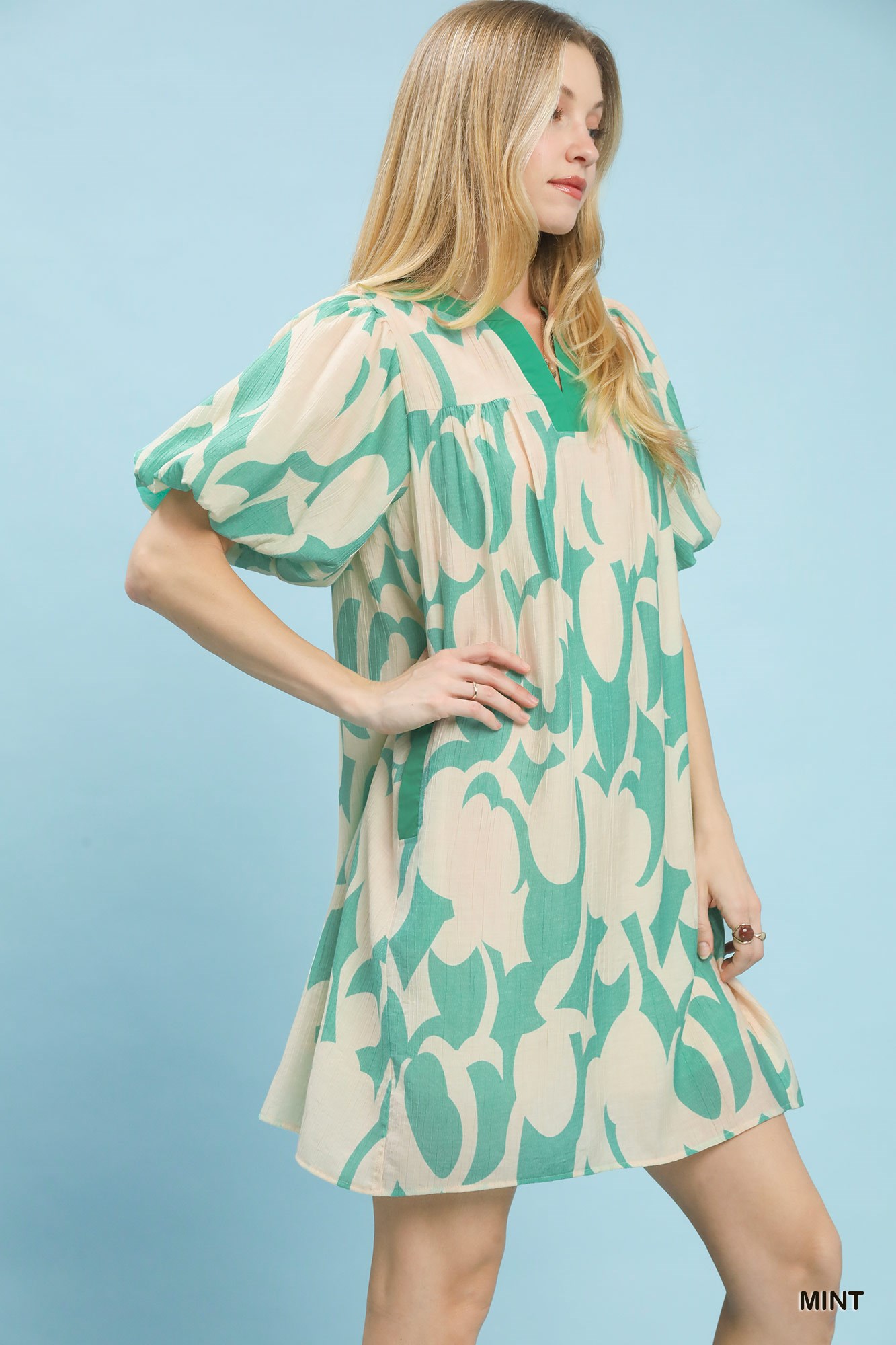 This mini dress features a vibrant mint green and beige floral print, perfect for a casual and stylish look. The V-neckline and short sleeves add a touch of elegance, while the lightweight and breathable fabric ensures comfort. Made from a soft and flowy material, this dress is ideal for warm weather. The relaxed fit makes it easy to wear and move in, making it a versatile addition to any wardrobe. The dress falls into the 'All Dresses' category, emphasizing its suitability for various occasions. The material is likely a blend of rayon or polyester, offering both comfort and durability.
