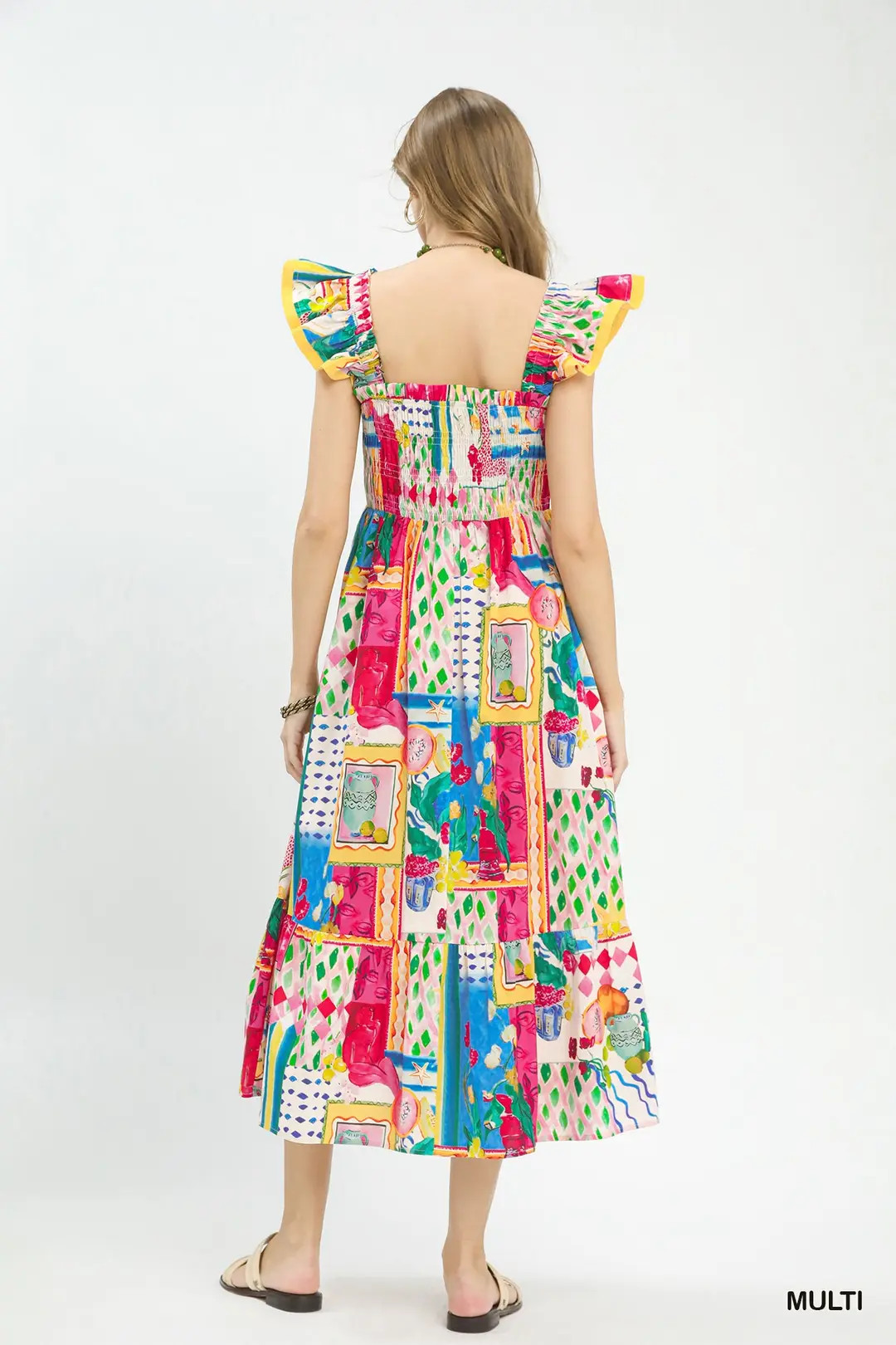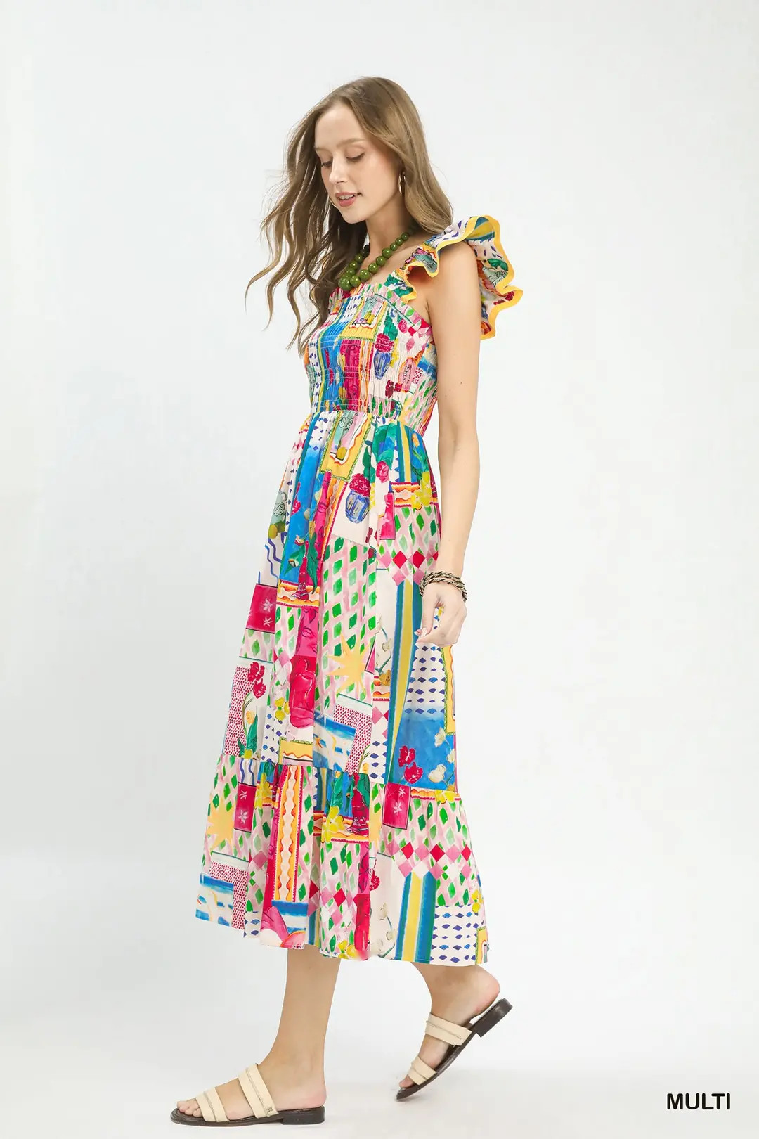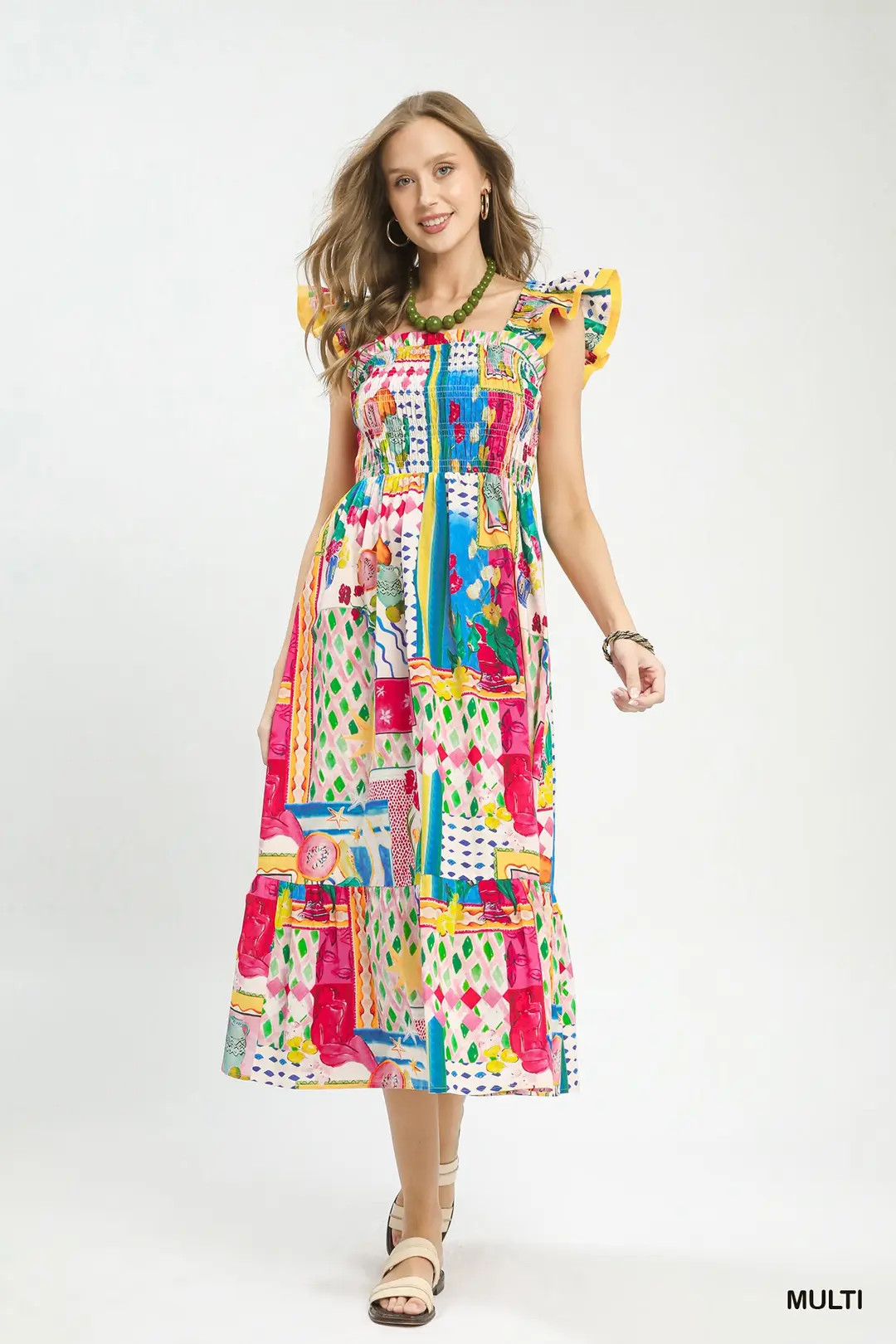 This stylish midi dress features a unique abstract print that stands out with artistic flair. It has a square neckline paired with gentle ruffle flutter sleeves for a soft, feminine look. The smocked bodice ensures a comfortable, stretchy fit, while delicate lace trim adds subtle romantic detailing. The tiered skirt creates lovely flow and movement, and the unlined design keeps it lightweight and breathable. Ideal for weekend outings, vacations, and casual daytime occasions.
