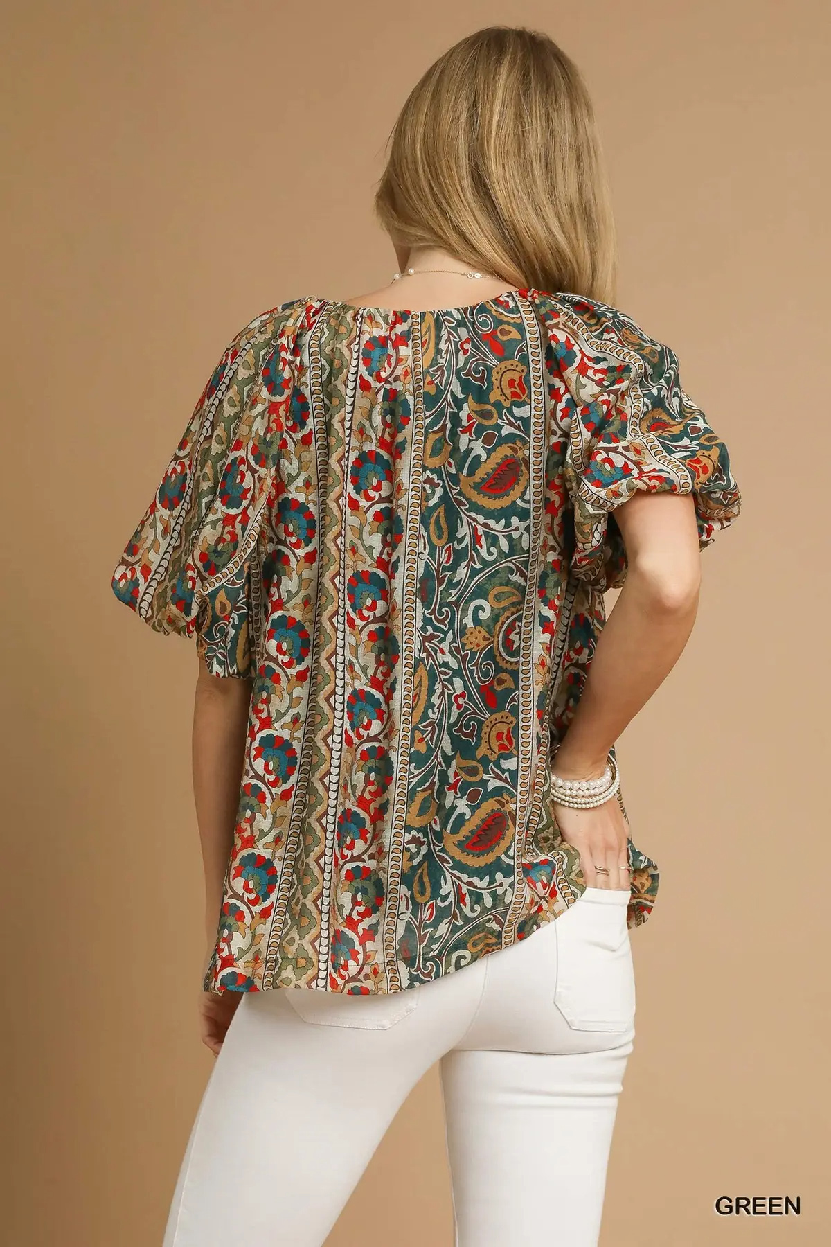 The boho floral stripe puff sleeve blouse is a charming and whimsical piece that combines floral and striped patterns for a unique look. The bohemian-inspired design adds a free-spirited and artistic touch to the blouse. The puff sleeve detail creates a romantic and feminine silhouette, adding a touch of drama to the top. This blouse is perfect for showcasing your eclectic style and creating a boho-chic outfit. Pair it with denim shorts or flowy pants for a relaxed and effortlessly stylish ensemble that exudes a carefree vibe.