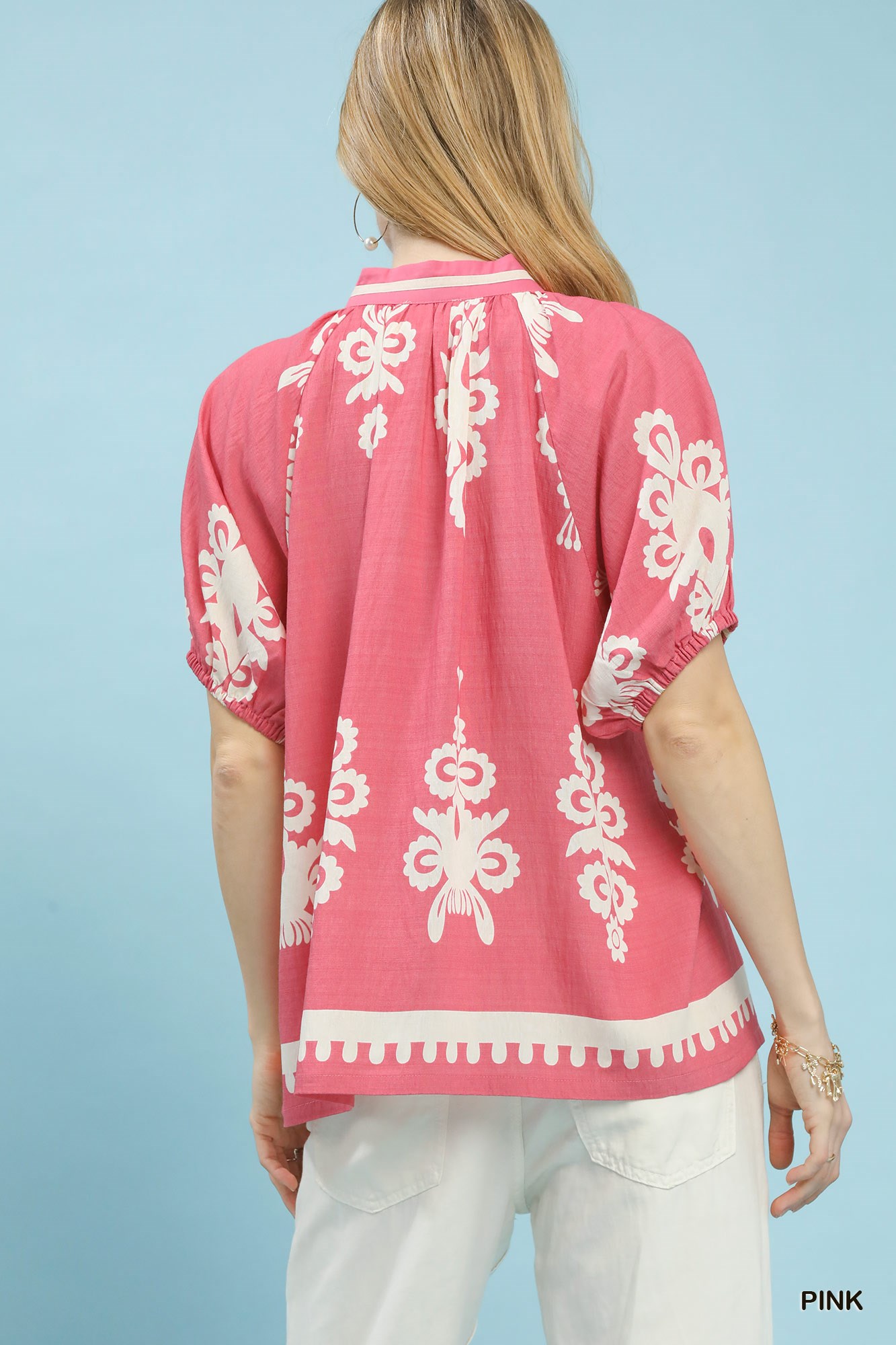 This Boho Print Split-Neck Short Sleeve Top showcases a vibrant boho pattern and a stylish split neck for a free-spirited look. It features short sleeves and a relaxed fit that ensures all-day comfort. The soft, lightweight fabric enhances breathability and effortless wear. The bohemian print adds artistic charm and a unique visual appeal. Versatile and easy to style, it’s perfect for casual outings and warm-weather days.
