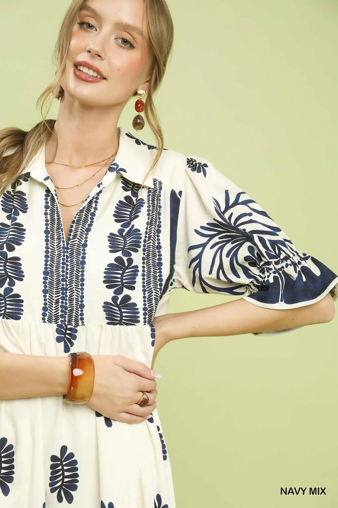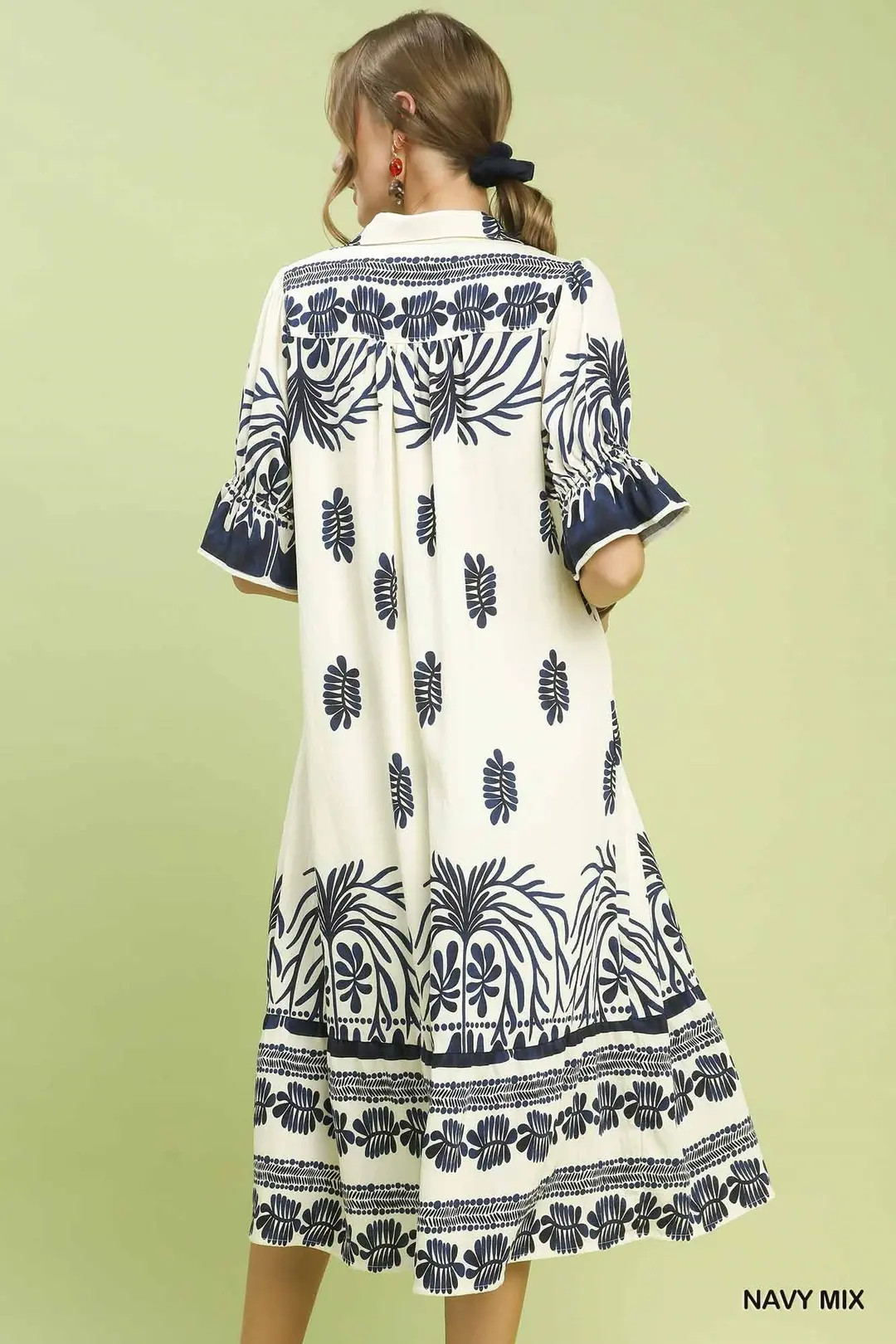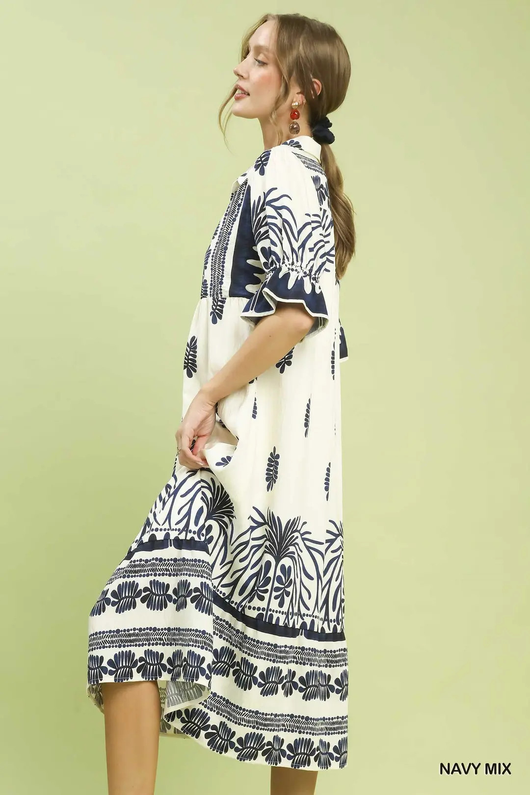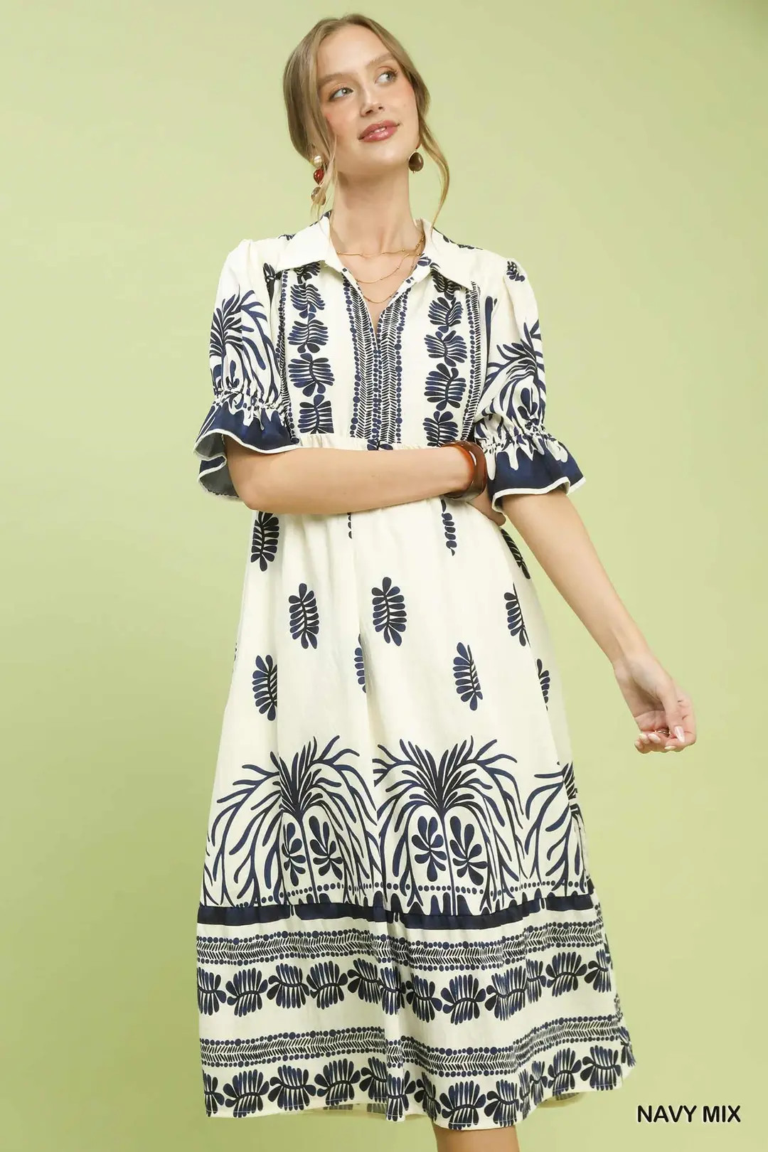 This elegant midi dress showcases a refined border print design, accented with delicate contrast trim for a polished, eye-catching finish. It features a flattering split V-neck and soft puff sleeves that lend a romantic, feminine silhouette. The midi length flows gracefully, while the full lining ensures comfortable, non-sheer wear. Ideal for brunch, garden outings, and casual daytime events, it blends timeless charm with modern detailing.