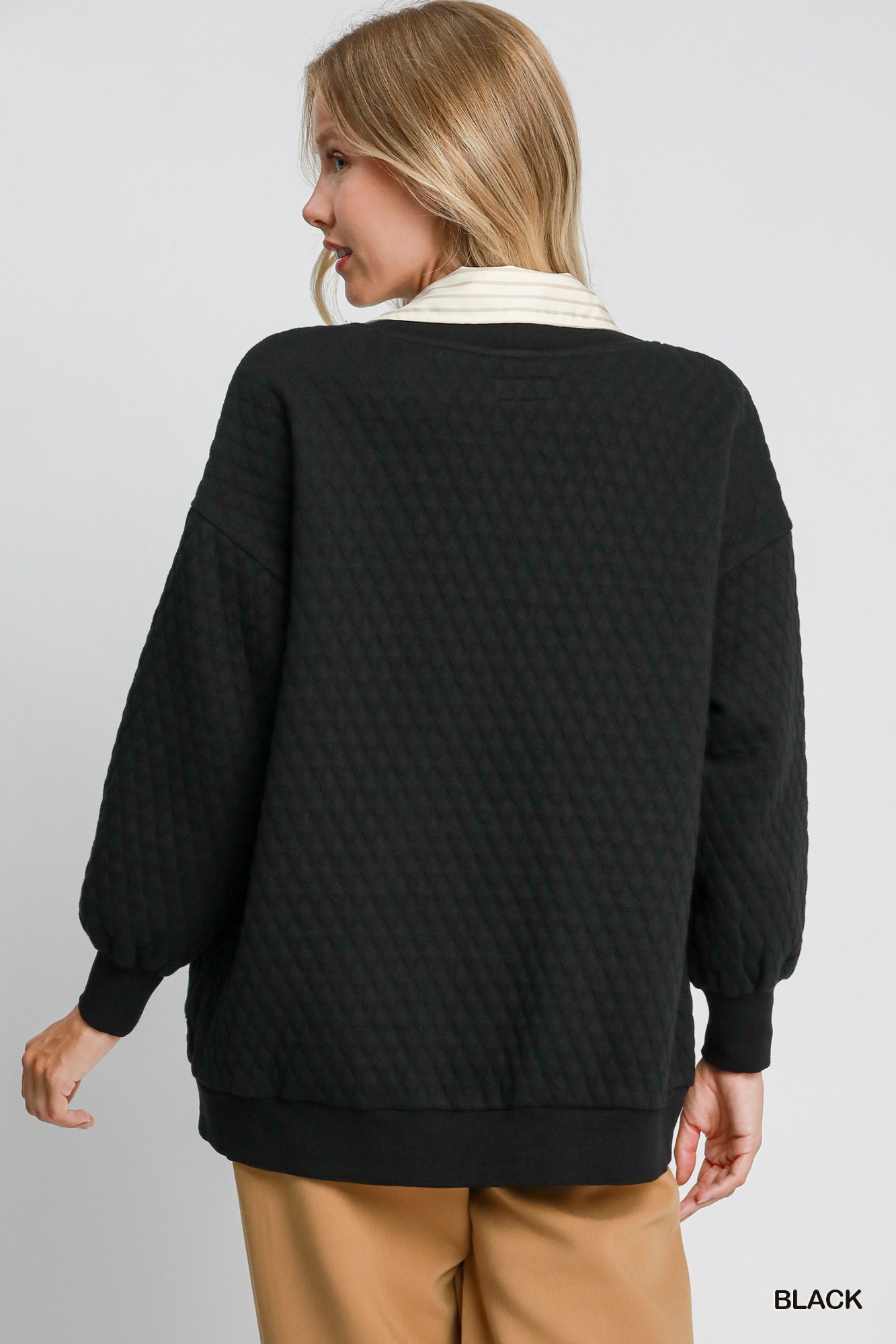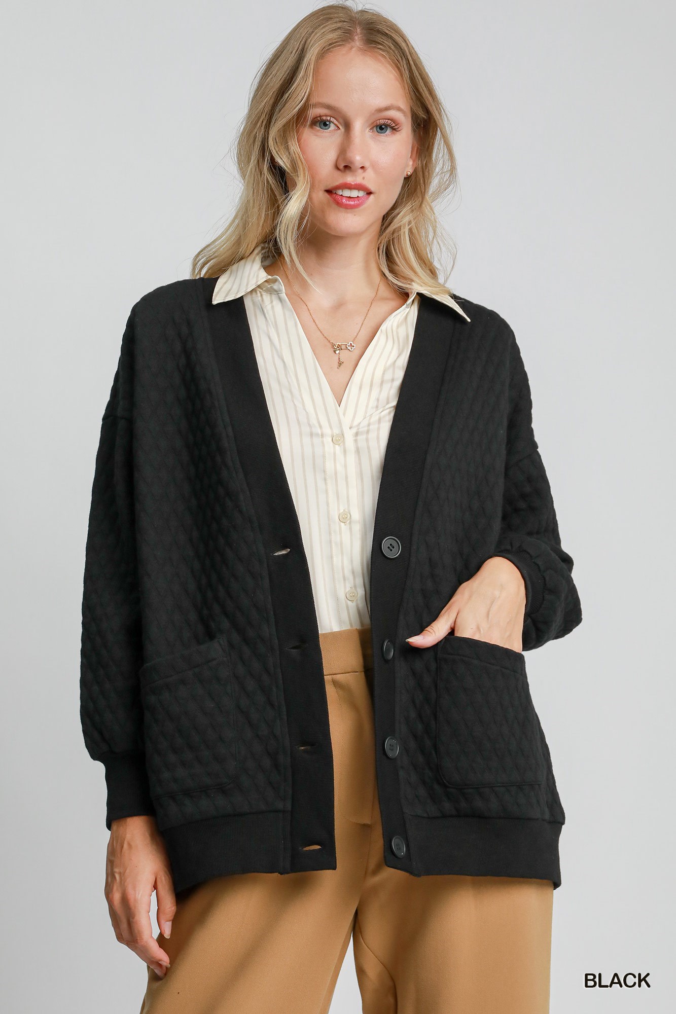 This classic black knit cardigan features a comfortable relaxed fit with traditional button-front closure and ribbed knit construction. Made from soft knit material, it offers versatile layering options for casual and everyday wear. The V-neck design and long sleeves provide comfortable coverage while maintaining a timeless cardigan silhouette. Perfect for pairing with various outfits, this piece combines comfort with classic styling for effortless casual elegance.