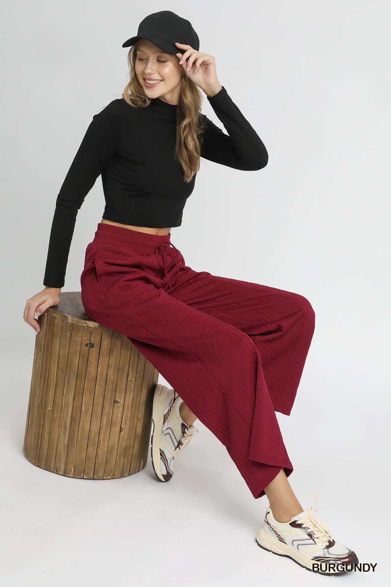 The Cable Knit Textured Wide Leg Pants are a cozy and stylish addition to your wardrobe. The cable knit texture adds a touch of warmth and visual interest to these pants. With their wide leg silhouette, they offer a comfortable and relaxed fit that is perfect for lounging or running errands. These pants are versatile and can be dressed up or down depending on the occasion. Elevate your casual chic style with these fashionable and comfortable cable knit wide leg pants.