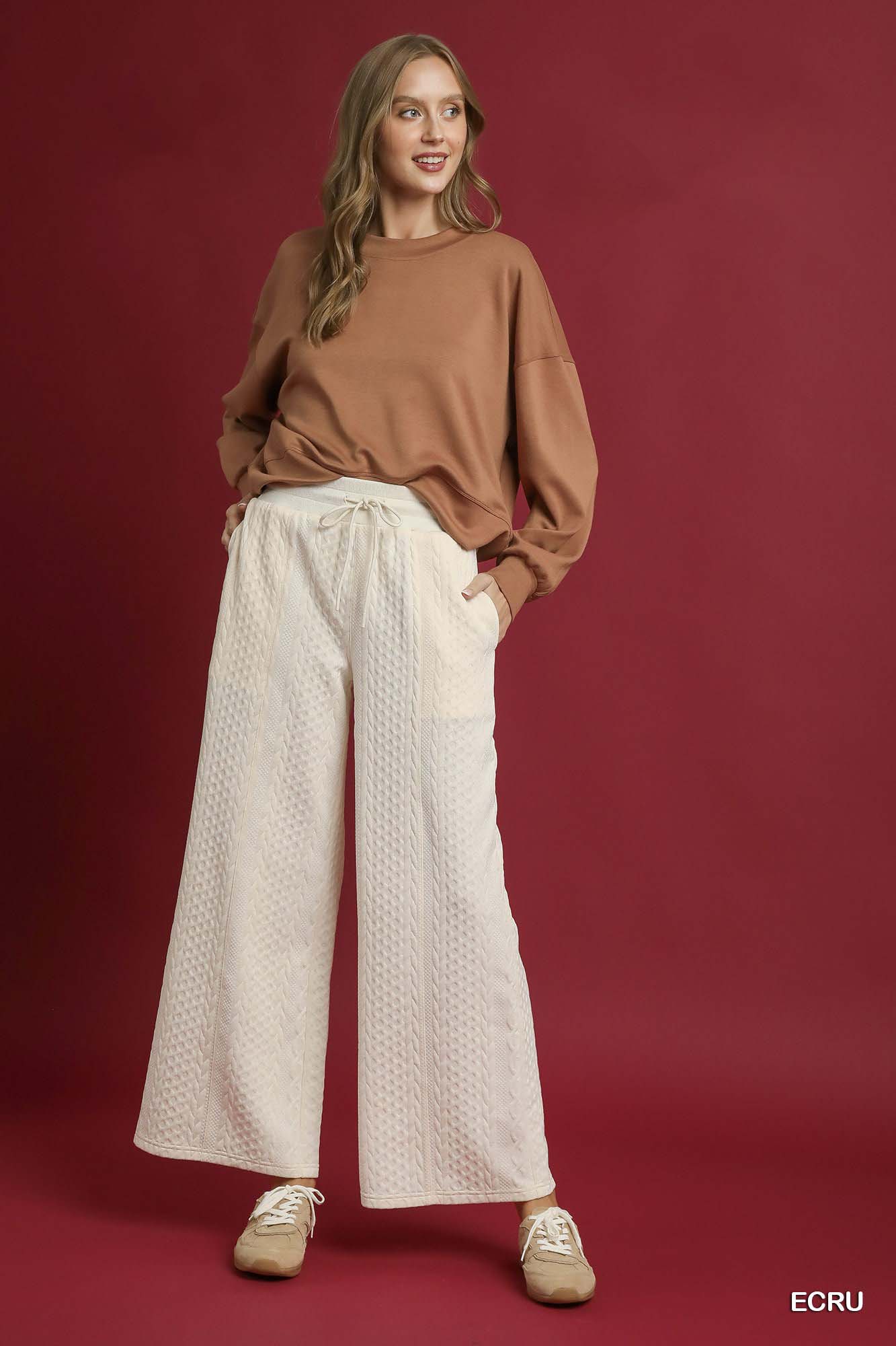 The Cable Knit Textured Wide Leg Pants are a cozy and stylish addition to your wardrobe. The cable knit texture adds a touch of warmth and visual interest to these pants. With their wide leg silhouette, they offer a comfortable and relaxed fit that is perfect for lounging or running errands. These pants are versatile and can be dressed up or down depending on the occasion. Elevate your casual chic style with these fashionable and comfortable cable knit wide leg pants.