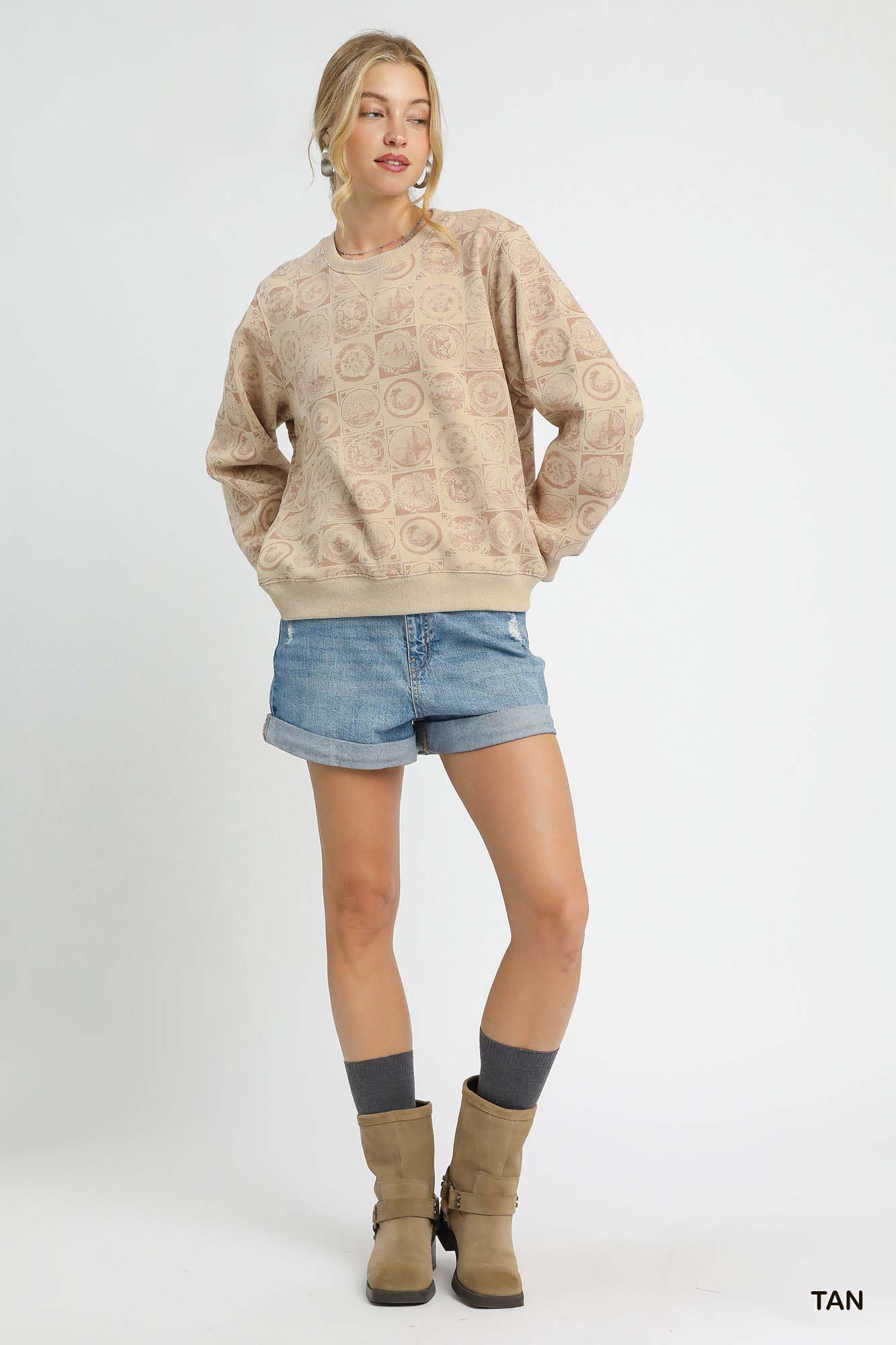The Coin Stamp Print Sweatshirt features a pullover design with a crew neck and V-stitch detail for a classic look. Its long sleeves come with ribbed cuffs for a comfortable fit. The ribbed bottom hem adds a touch of texture and style to the sweatshirt. This piece does not have a lining, making it ideal for layering over your favorite tops. Elevate your casual wardrobe with this versatile and timeless sweatshirt that combines comfort and style effortlessly.