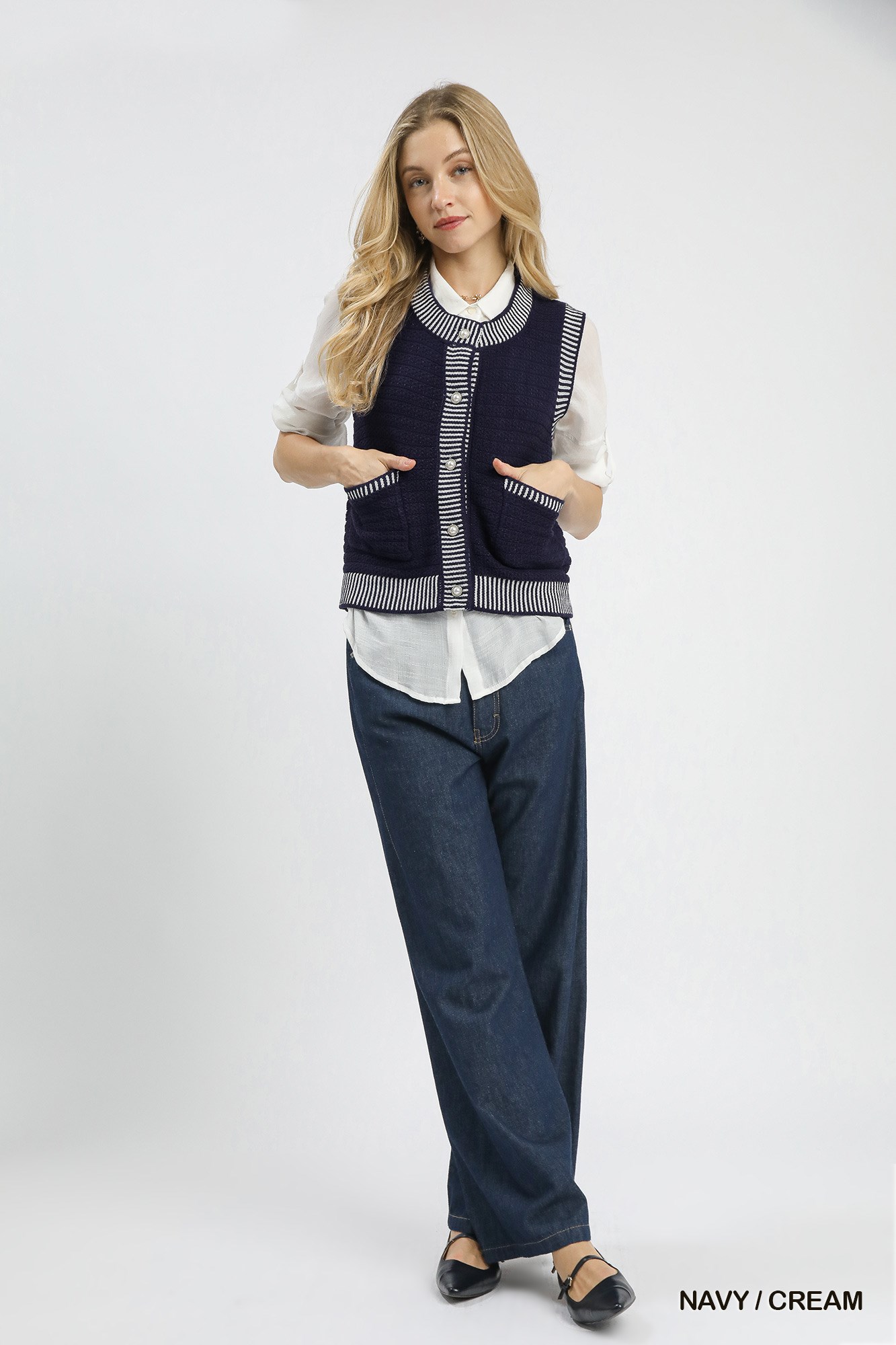 This Striped Knit Button Vest features a textured knit with contrasting striped trim, giving it a stylish and eye-catching look. It is designed as a sweater vest with a convenient front button-down closure for easy wearability. The front patch pockets add a touch of functionality and charm to the vest. Please note that this vest is not lined, making it a lightweight and versatile layering piece. Perfect for adding a touch of sophistication to your outfit.