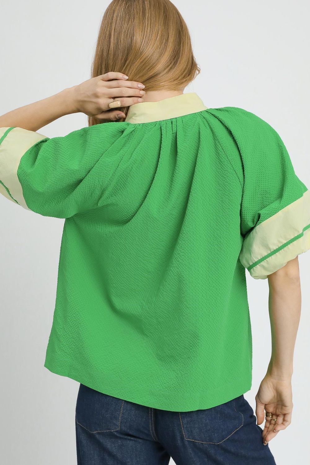 This stylish blouse features a vibrant green textured fabric with a distinctive V-neckline accented by contrasting lime green trim. The relaxed, oversized silhouette offers comfortable wear while the dolman sleeves add a contemporary touch. Made from lightweight, breathable material perfect for warm weather, this versatile piece combines casual comfort with bohemian flair. The textured surface adds visual interest while the hip-length cut pairs perfectly with jeans or skirts for effortless everyday style.