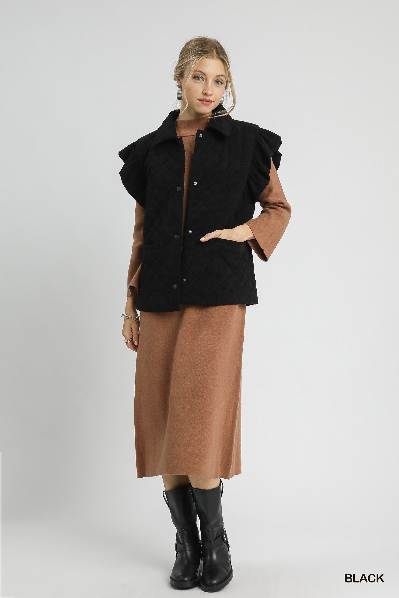 The Corduroy Quilted Ruffle Sleeve Vest is a stylish and cozy layering piece perfect for the cooler seasons. Made from soft quilted corduroy fabric with a diamond quilt pattern, it offers warmth and texture to your outfit. The ruffle cap sleeves add a feminine and playful touch to the vest's design. Featuring a front snap button closure and convenient side slip pockets, this vest combines fashion and functionality. With a lining for added comfort and quality, this versatile piece can be dressed up or down for a chic and on-trend look.