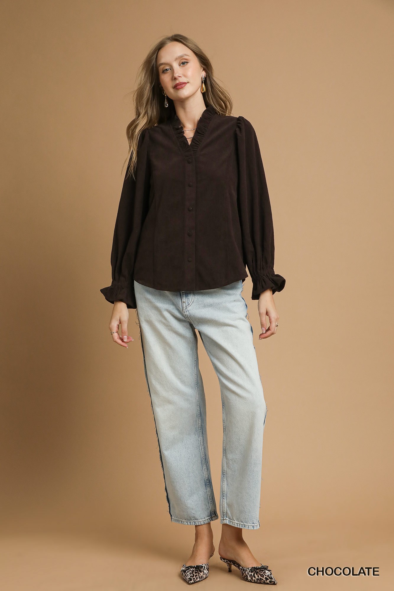 The corduroy ruffle shirt with long puff sleeves is a stylish and cozy addition to your fall wardrobe. The corduroy fabric adds a texture and warmth to the shirt. The ruffle detailing at the neckline and cuffs adds a feminine and chic touch. The long puff sleeves give a trendy and dramatic look to the shirt. Pair this shirt with jeans and boots for a chic and fashionable outfit perfect for the cooler weather.