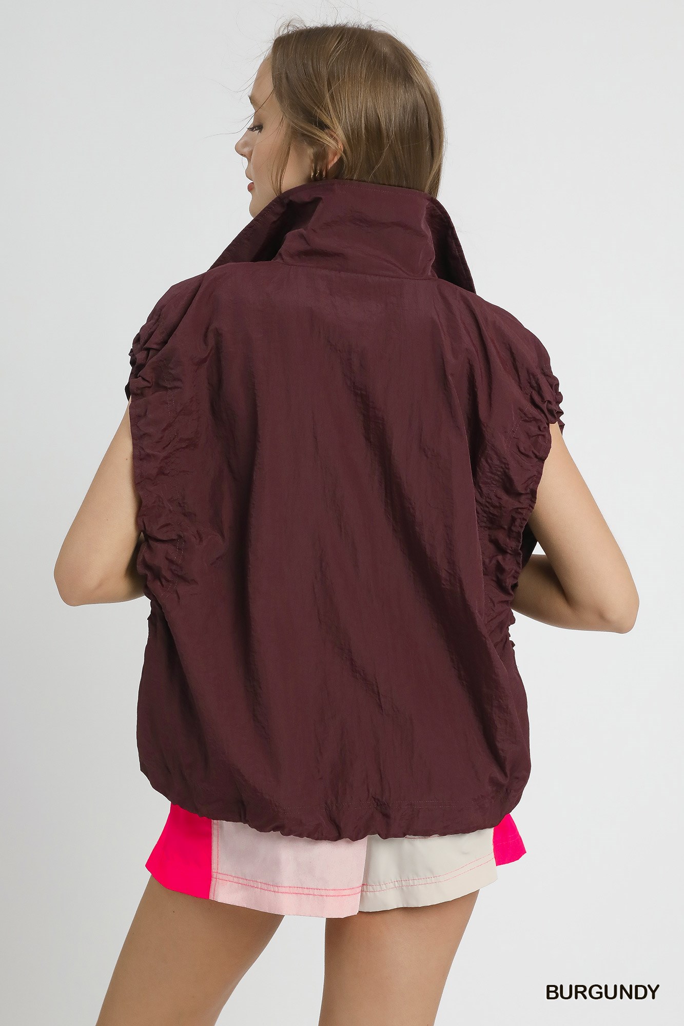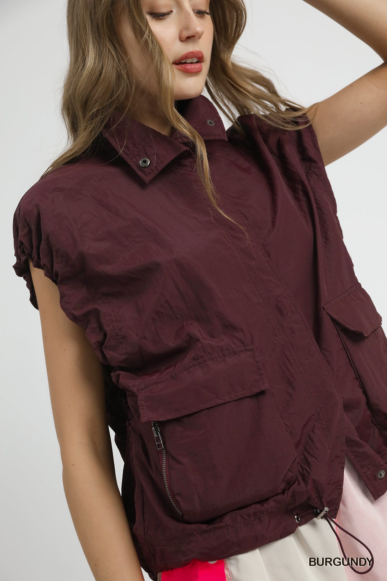 This nylon vest with pockets is designed with a versatile adjustable drawstring hem for a customizable fit. The snap button front closure adds convenience and style. With practical pockets for storing essentials, this vest combines functionality with a touch of feminine charm from the subtle ruffle trim on the shoulders. Additionally, the lining ensures added comfort and warmth, making it a perfect addition to your wardrobe for various occasions.