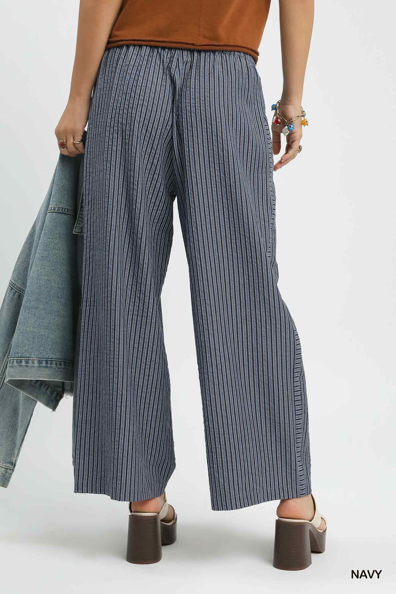 Drawstring striped wide-leg pants feature a comfortable drawstring waist and a trendy wide-leg silhouette with striped patterns. The drawstring waist allows for adjustable comfort and adds a casual vibe to the pants. The wide-leg style offers a relaxed and flowy fit that is both fashionable and comfortable. The striped patterns add a touch of style and visual interest to the pants, making them versatile for various outfits. Overall, drawstring striped wide-leg pants are a stylish and practical choice that can be dressed up or down for a variety of occasions.