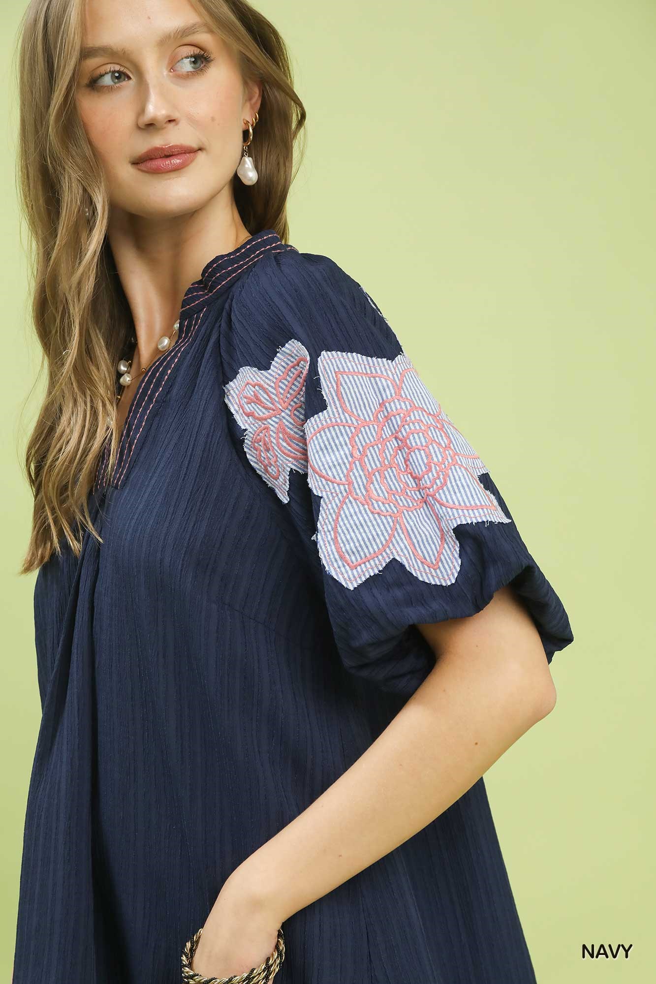 The Embroidered Balloon Sleeve Notch Neck Blouse is a stunning and unique piece that will elevate your style. Its textured fabric and embroidered floral balloon sleeves add a touch of elegance and charm. The Notch V-neck with contrast stitching adds a subtle yet fashionable detail to the blouse. The short elasticized sleeves provide comfort and a chic look. With the sleeves lined for added sophistication, this blouse is perfect for both casual and dressier occasions. Make a statement with the Embroidered Balloon Sleeve Notch Neck Blouse and showcase your fashion-forward style effortlessly.