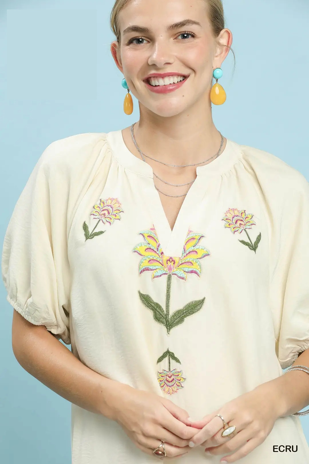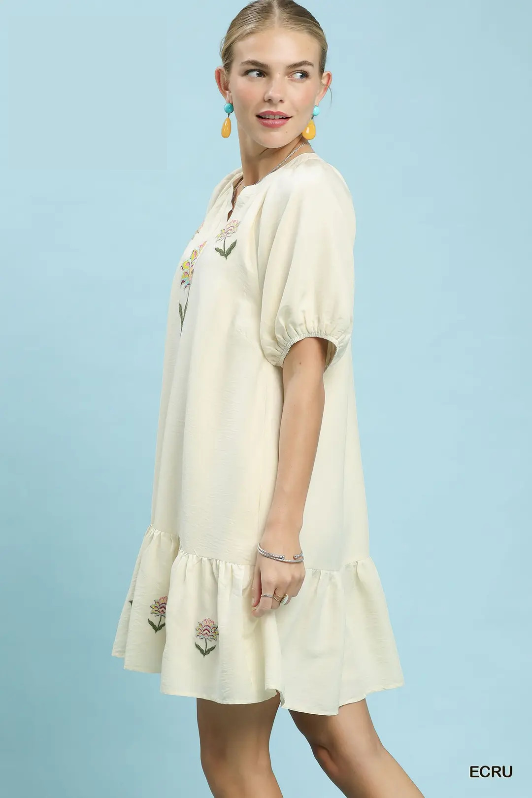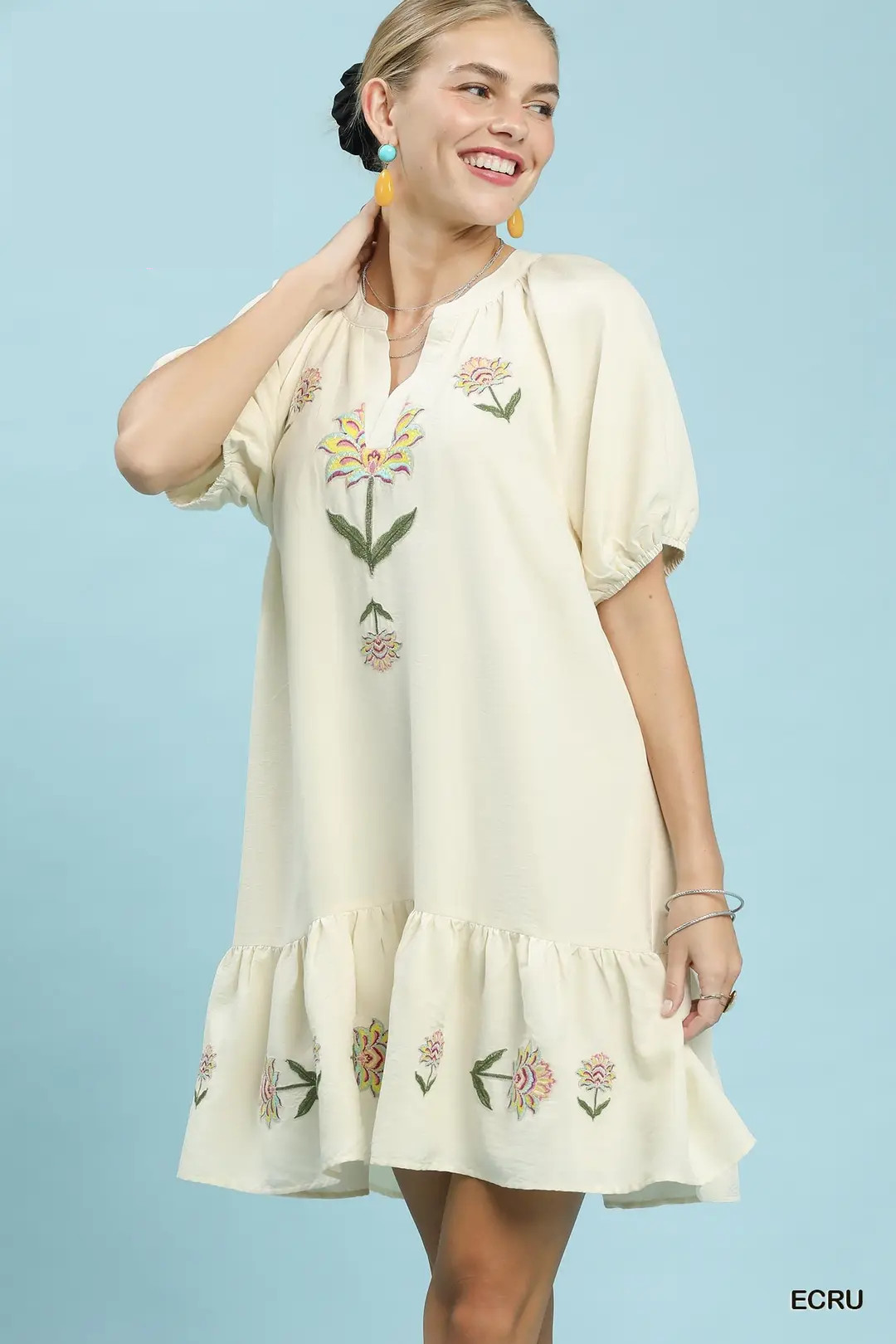 This embroidered floral babydoll dress showcases exquisite floral embroidery detailing, lending it a romantic, artisanal allure with unique handcrafted charm. It features a flattering V-neckline accented with delicate gathered details, paired with short puff sleeves finished with elastic cuffs for a soft, feminine silhouette. Designed with convenient side pockets, the dress boasts a flowy drop-waist silhouette enhanced by a gathered ruffle tier that creates gentle movement and dimension. Fully lined for comfort and coverage, this piece effortlessly blends sweet, vintage-inspired design with everyday practicality, making it perfect for casual outings, daytime events, and warm-weather occasions.