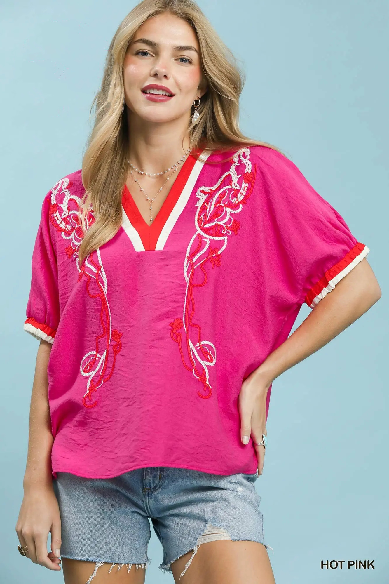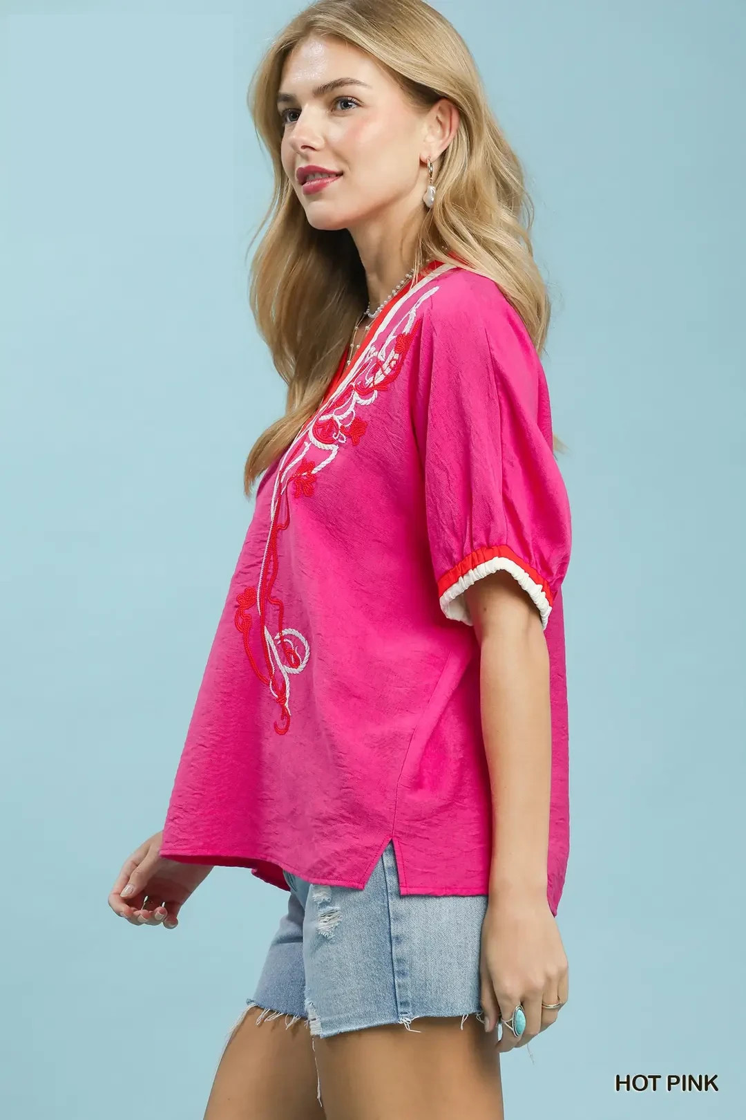 This charming embroidered top features intricate floral embroidery across the neckline and front bodice, bringing artisanal detail and soft boho elegance. Enhanced by contrast trim along the V-neckline and delicate ruffle cuffs, it delivers eye-catching layered detail and romantic appeal. Crafted in a boxy, relaxed silhouette for a laid-back, comfortable fit, the unlined construction keeps the fabric lightweight and breathable for all-day wear. Effortlessly versatile and easy to style, it pairs beautifully with denim, shorts and casual bottoms, perfect for daily outings, weekend trips, brunch and everyday casual looks.