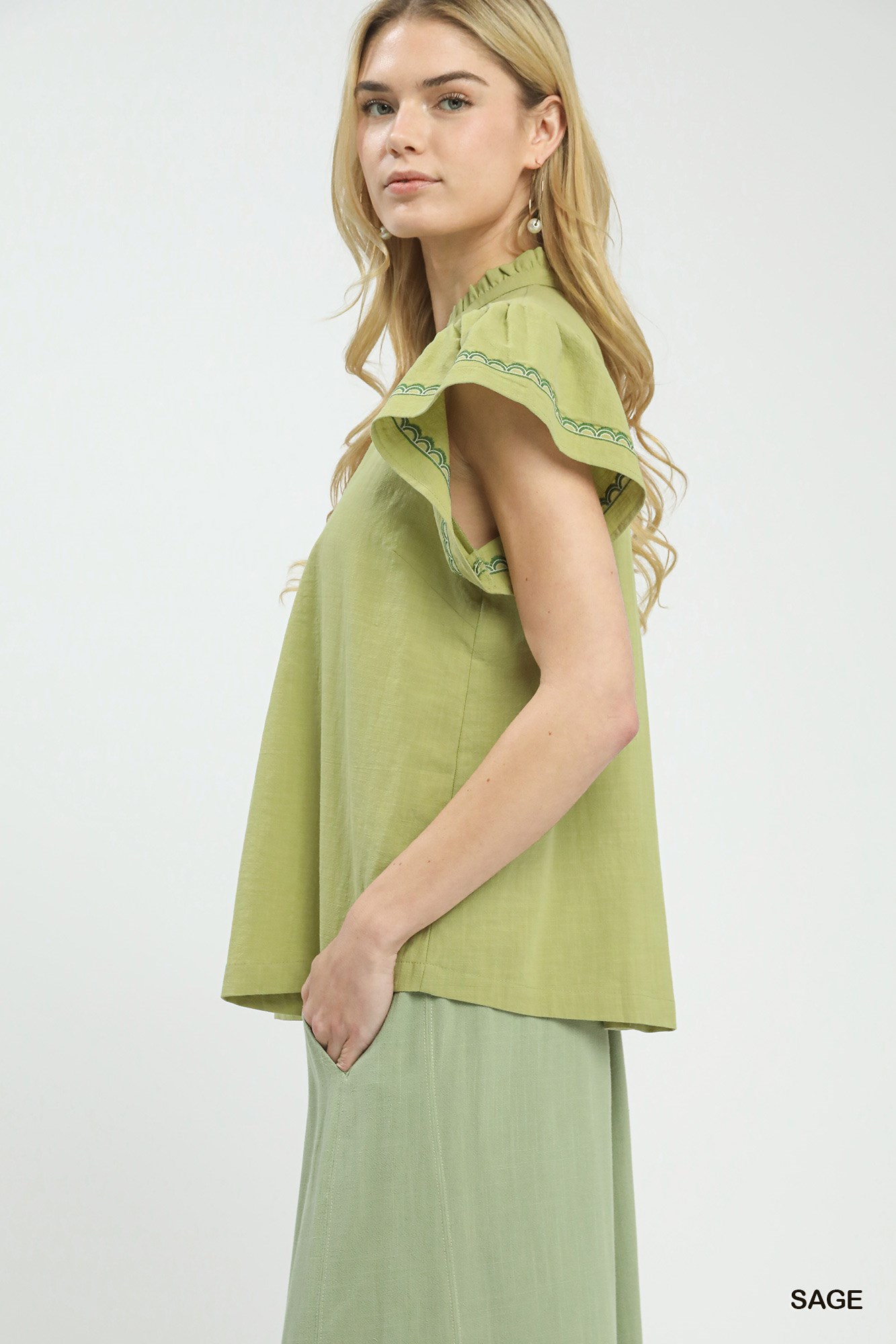 Upgrade your look with the chic Embroidered Flutter Sleeve Blouse. The split V-neck with embroidered trim adds a stylish detail to this top. Featuring flutter sleeves for a touch of femininity, this blouse offers a flowy silhouette that is perfect for both casual and dressy occasions. Please note that this blouse is not lined, ensuring a lightweight and comfortable fit. Embrace effortless style with this versatile and fashionable piece.