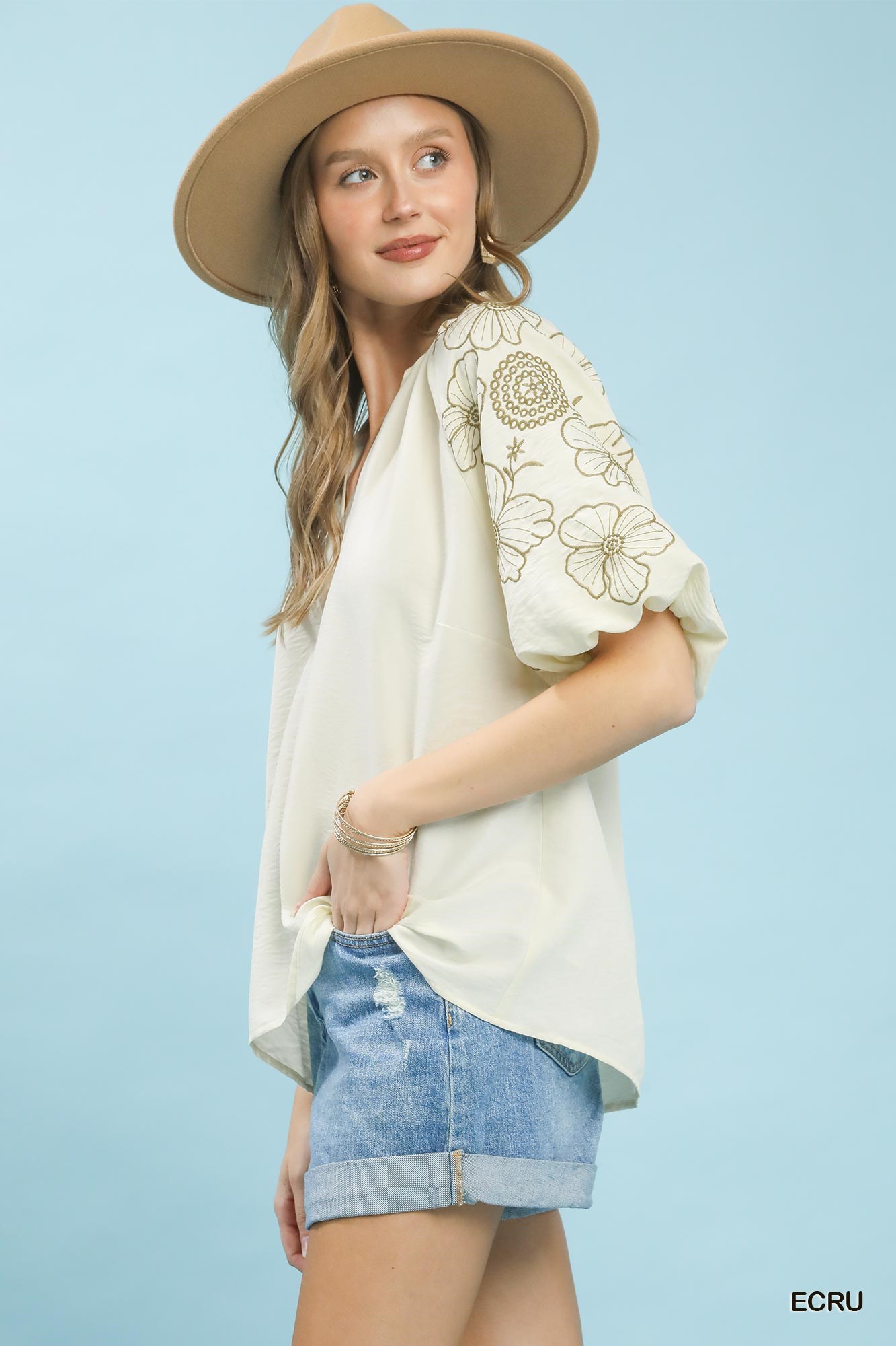 This stylish blouse features delicate floral embroidery on the puff sleeves, adding a touch of elegance and femininity. Made from a lightweight and breathable fabric, this top is perfect for warm weather. The versatile style can be dressed up or down, making it suitable for both casual and dressy occasions. Pair it with jeans or shorts for a casual look, or dress it up with a skirt and heels for a more formal event. The blouse is easy to care for and available in multiple sizes. The unique design and attention to detail make this blouse a must-have addition to any wardrobe.