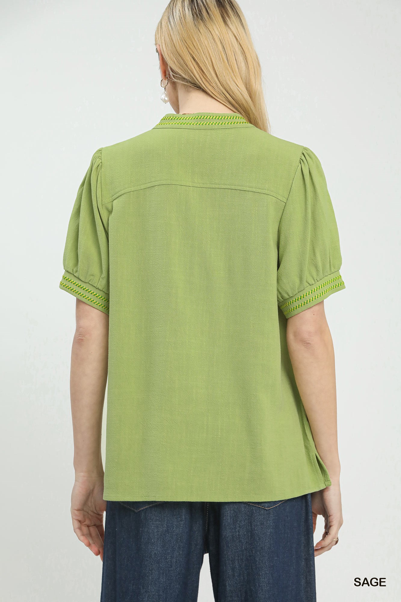 This Embroidery Linen Puff Sleeve Blouse is crafted from breathable linen for lightweight, all-day comfort. It showcases delicate embroidery that adds elegant, artisanal detail to the design. Gentle puff sleeves create a soft, romantic silhouette with subtle volume. The natural linen texture enhances its relaxed yet refined vibe. Perfect for casual outings or dressy occasions, it pairs beautifully with bottoms for a timeless, chic look.