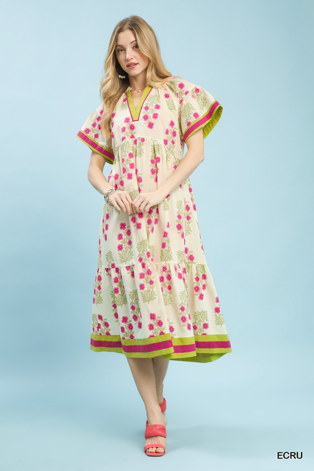 The Floral Border Tiered Midi Dress showcases a lovely mandarin collar for a touch of elegance. With wide short sleeves, the dress offers a relaxed and comfortable fit. The tiered midi-length silhouette creates a bohemian and romantic vibe. Additionally, the dress is lined for added comfort and modesty. An ideal choice for a charming and effortless summer ensemble!