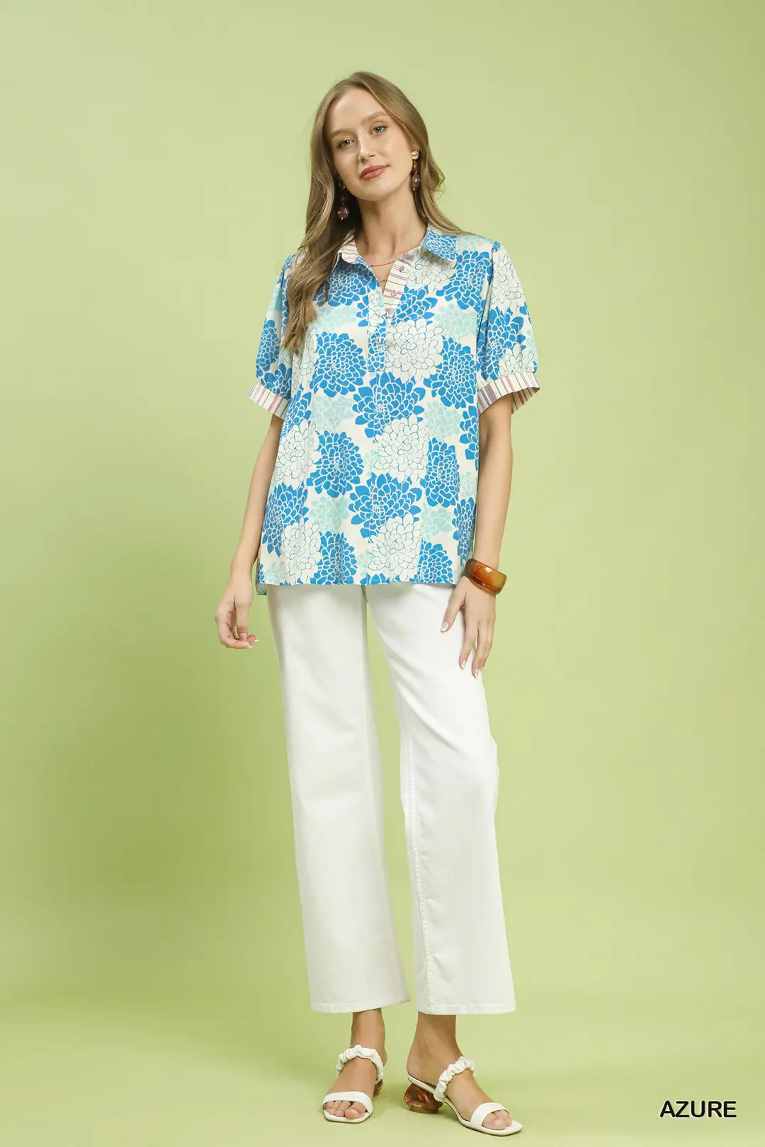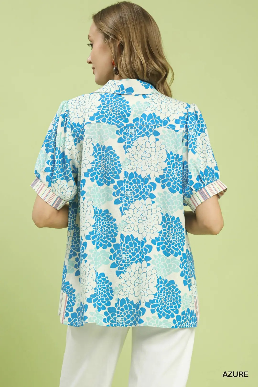 The Floral Collared Short Sleeve Blouse is a charming and versatile piece for your wardrobe. Made from linen, this blouse offers a lightweight and breathable feel. The floral print with multi-stripe contrast adds a cheerful and vibrant touch to the design. Featuring a collared V-placket, this blouse exudes a classic and polished look. The short sleeves with striped contrast cuffs provide a trendy and stylish detail. Perfect for adding a pop of color and femininity to your outfit, the Floral Collared Short Sleeve Blouse is a chic and playful top for various occasions.