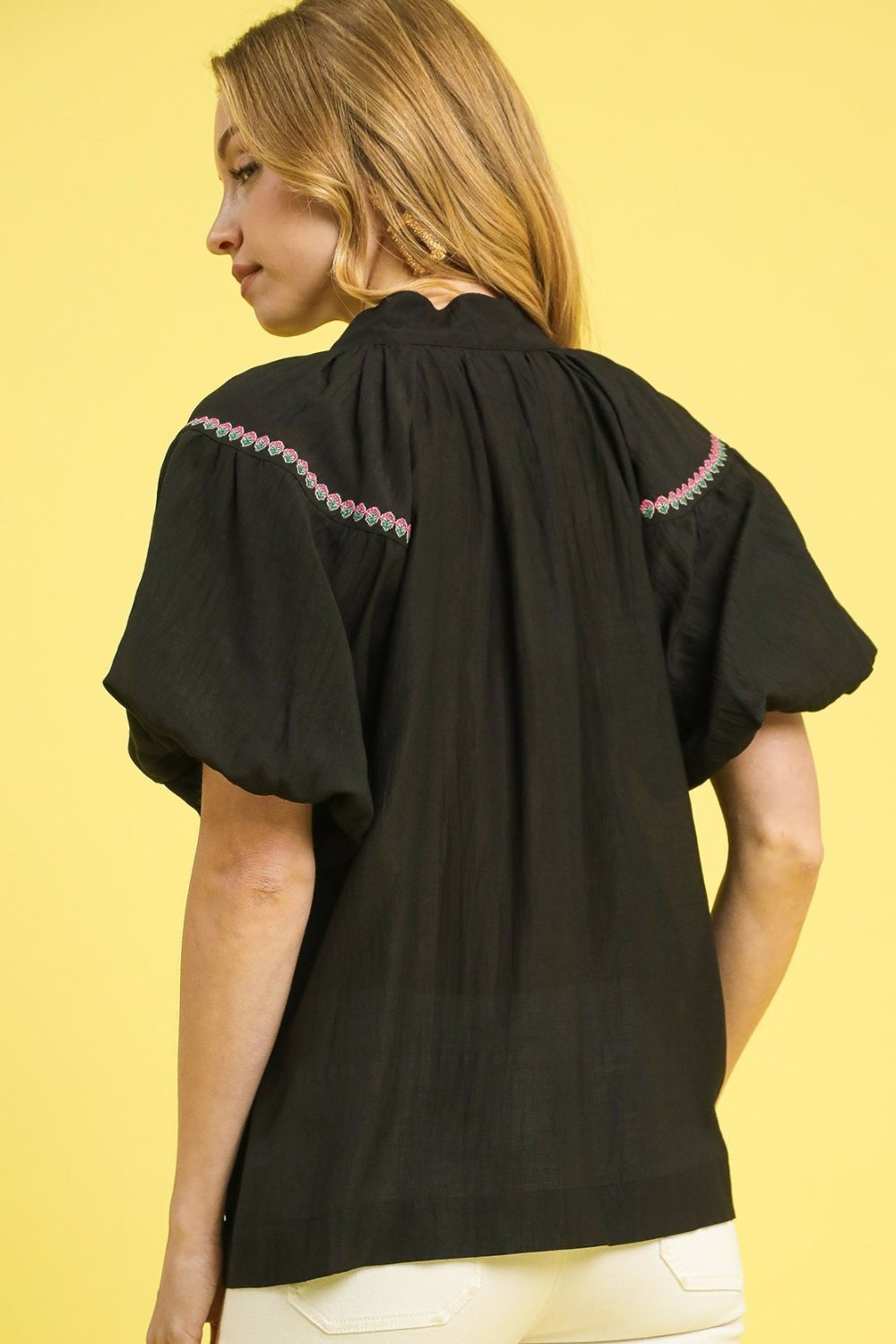 This elegant black blouse features delicate pink carnation embroidery throughout, creating a stunning contrast against the dark fabric. The V-neckline with collar detail offers a sophisticated touch, while the short flutter sleeves add feminine charm. Made from lightweight, breathable material perfect for warm weather, this relaxed-fit blouse combines comfort with style. The embroidered floral motifs are strategically placed for visual interest, making it ideal for both casual outings and semi-formal occasions. The button-front closure allows for versatile styling options.