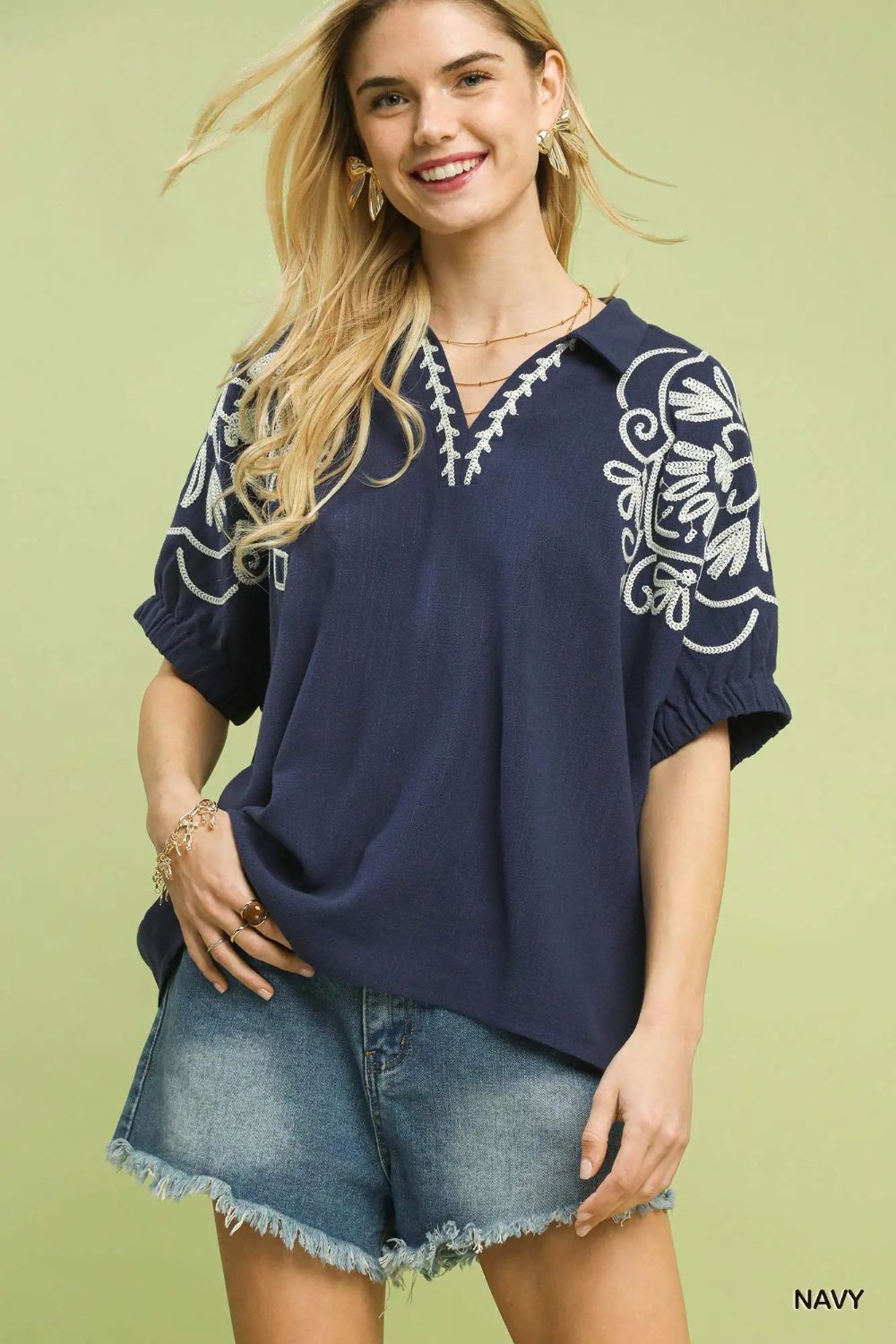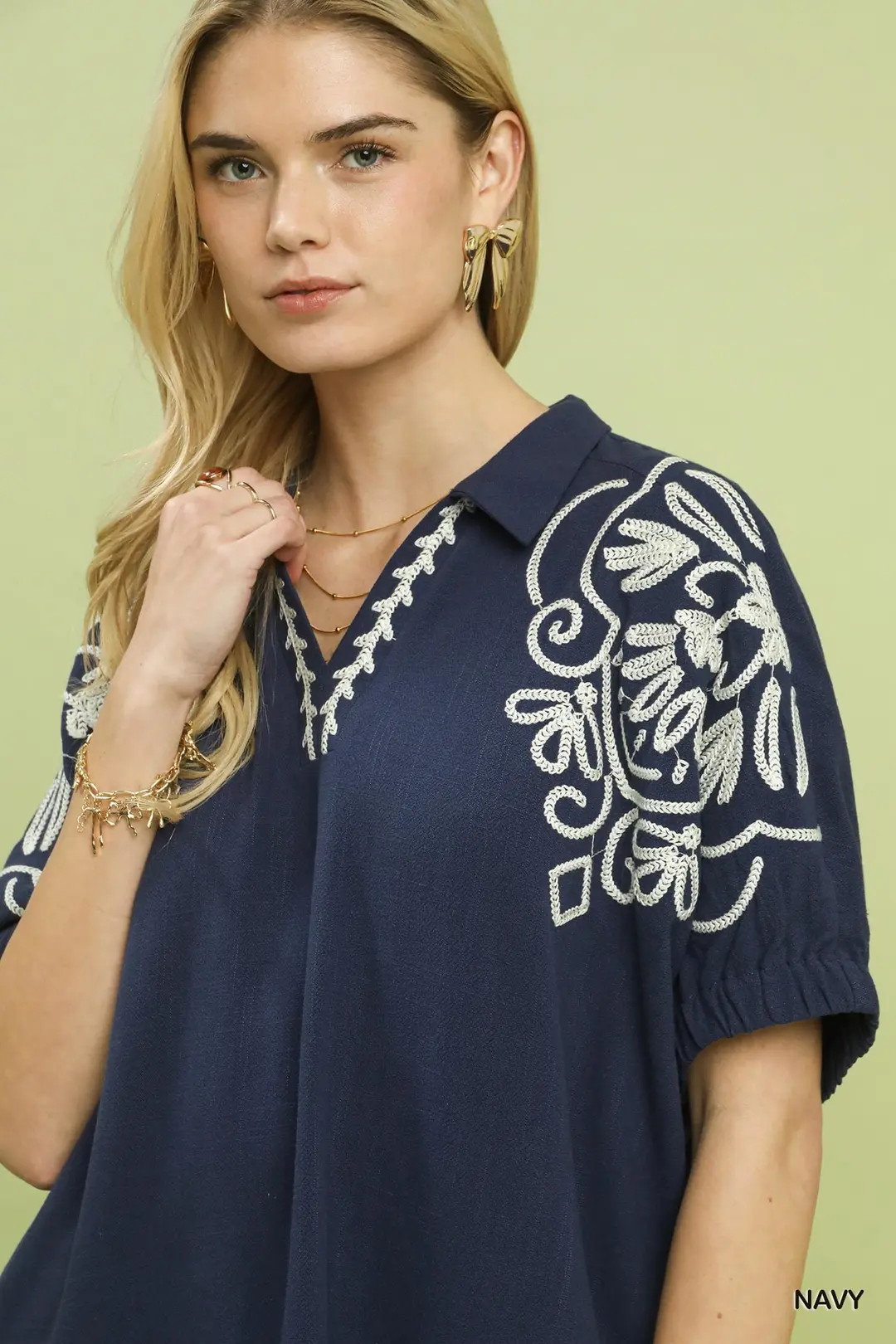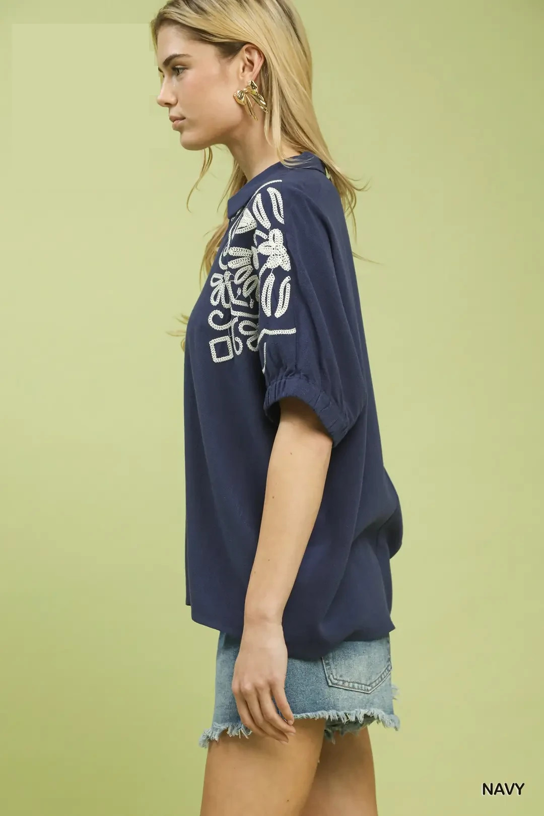 This elegant blouse features exquisite floral embroidery on the sleeves, bringing refined artisan detail and soft romantic charm. Designed with a timeless relaxed silhouette and lightweight breathable fabric, it ensures all-day comfort and effortless movement. The delicate embroidered detailing adds subtle texture and boho-inspired elegance, easily elevating any casual outfit. Versatile for daily wear, office casual, brunch gatherings and weekend outings, it pairs beautifully with jeans, tailored pants and flowy skirts for endless styling options.